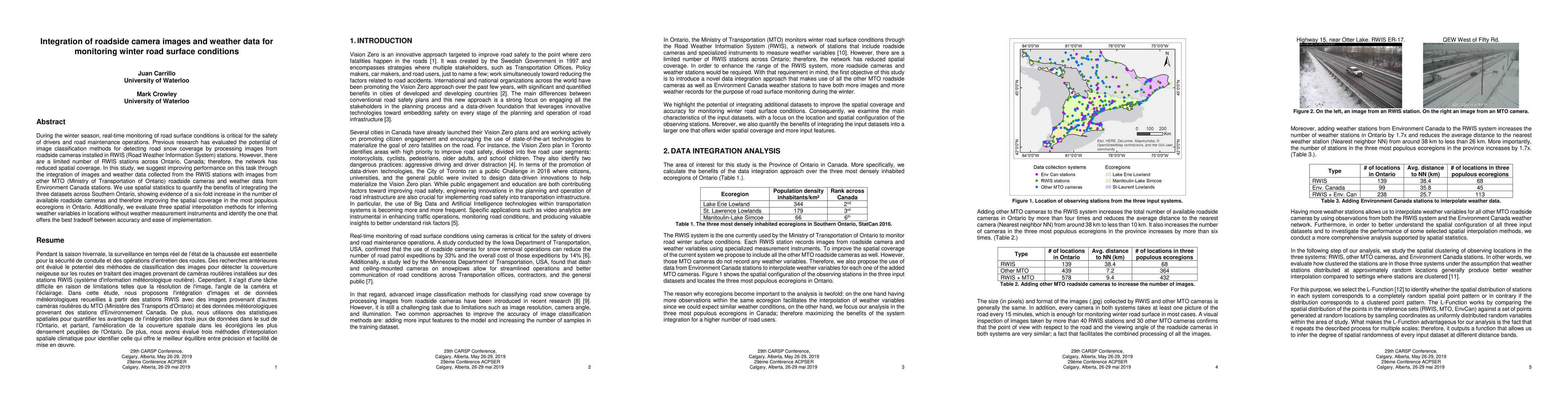 This study integrates roadside camera images and weather data from RWIS stations with additional MTO cameras and Environment Canada data to enhance winter road surface condition monitoring in Ontario, achieving a six-fold increase in camera coverage and evaluating spatial interpolation methods for weather data in unmeasured areas.