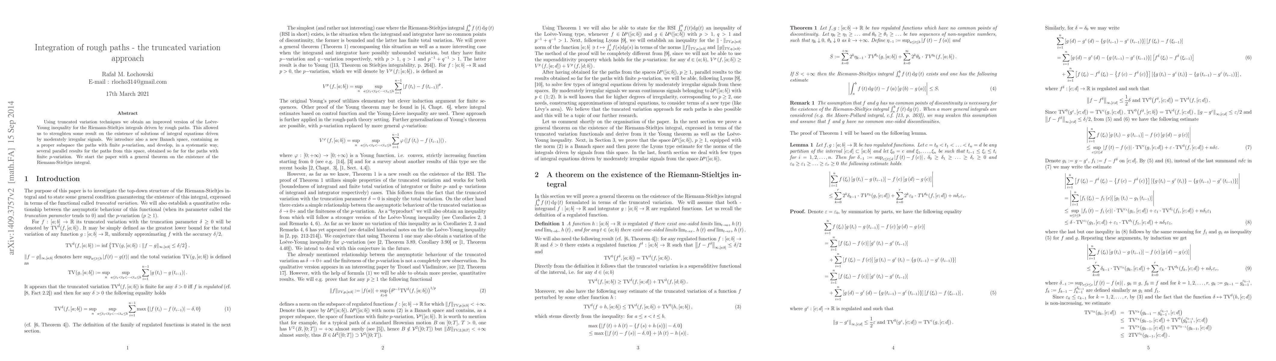 Using truncated variation techniques we obtain an improved version of the Loeve-Young inequality for the Riemann-Stieltjes integrals driven by rough paths. This allowed us to strenghten some result on the existence of solutions of integral equations driven by moderately irregular signals. We introduce also a new Banach space, containing as a proper subspace the paths with finite $p$-variation, and develop, in a systematic way, several parallel results for the paths from this space, obtained so far for the paths with finite $p$-variation. We start the paper with a general theorem on the existence of the Riemann-Stieltjes integral.