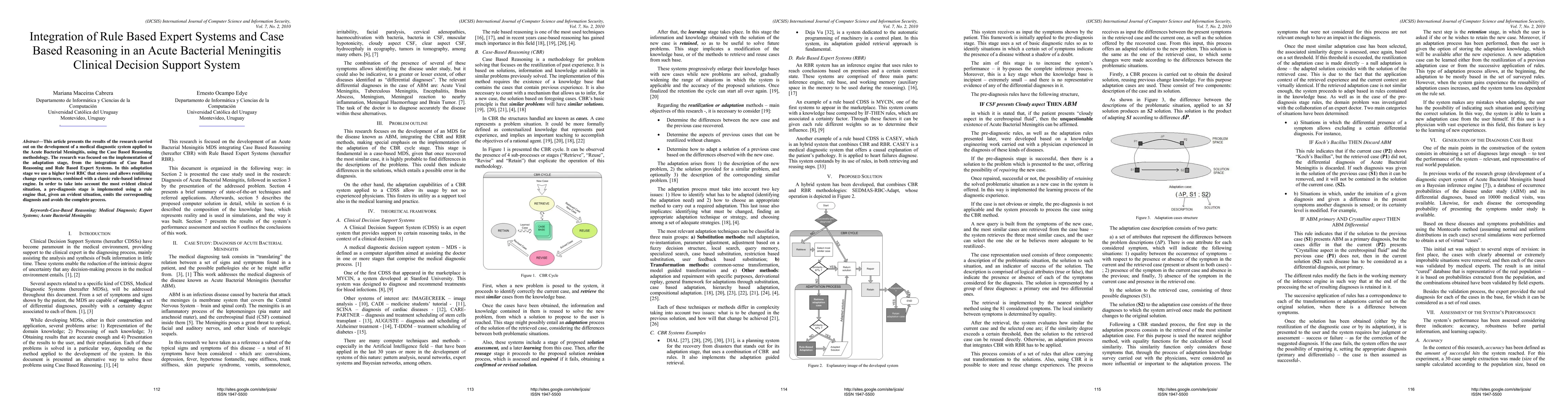 A medical diagnostic system was developed using Case Based Reasoning and Rule Based Expert Systems to diagnose Acute Bacterial Meningitis, integrating an adaptation stage for efficient diagnosis.