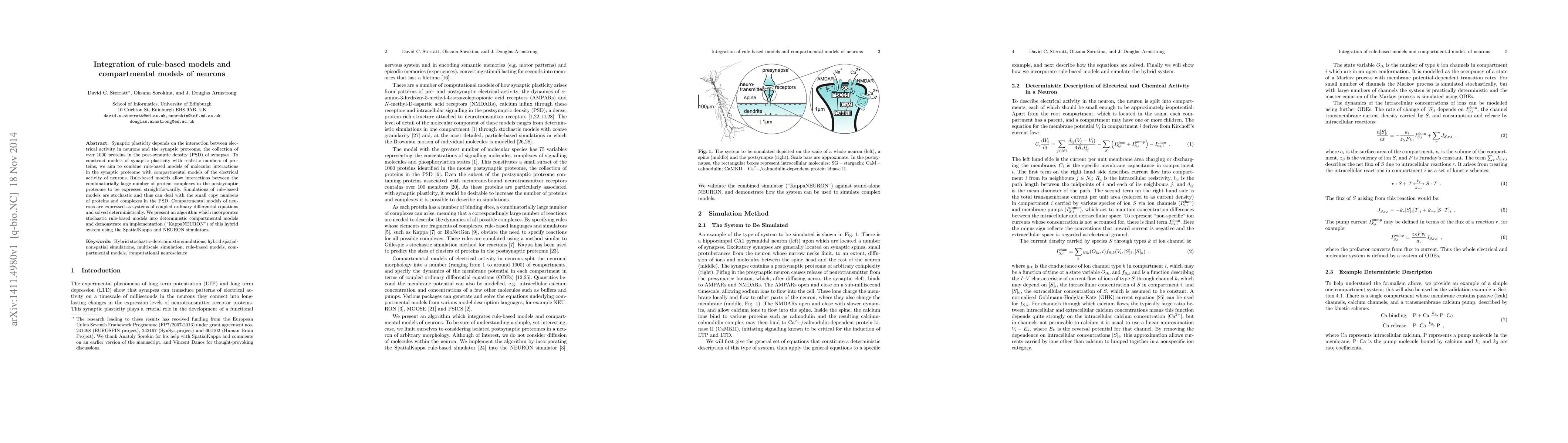This paper proposes an algorithm to integrate rule-based models of synaptic proteome interactions with compartmental models of neuronal electrical activity, creating a hybrid system called KappaNEURON. The aim is to realistically model synaptic plasticity by combining the stochastic nature of protein interactions with the deterministic electrical activity of neurons.