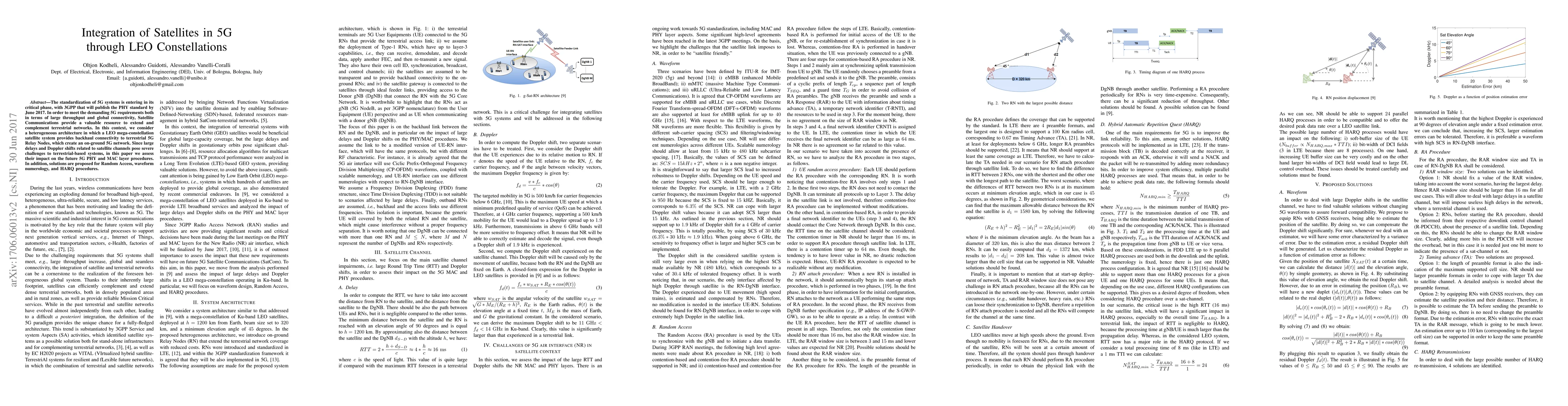 This paper explores integrating Low Earth Orbit (LEO) satellite constellations into 5G networks to enhance global connectivity and throughput. It assesses the challenges posed by satellite channels on 5G PHY and MAC layers and proposes solutions for Random Access, waveform numerology, and HARQ procedures.