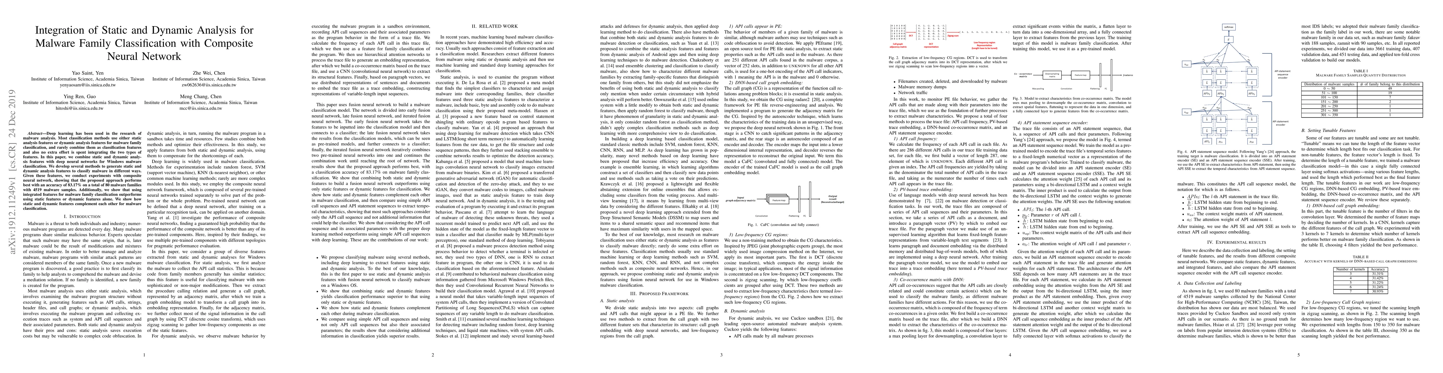 This paper proposes a composite neural network approach that integrates static and dynamic analysis features for Windows malware family classification, achieving an accuracy of 83.17%. The study demonstrates that combining both types of features outperforms using either type alone, highlighting their complementary nature in malware detection.