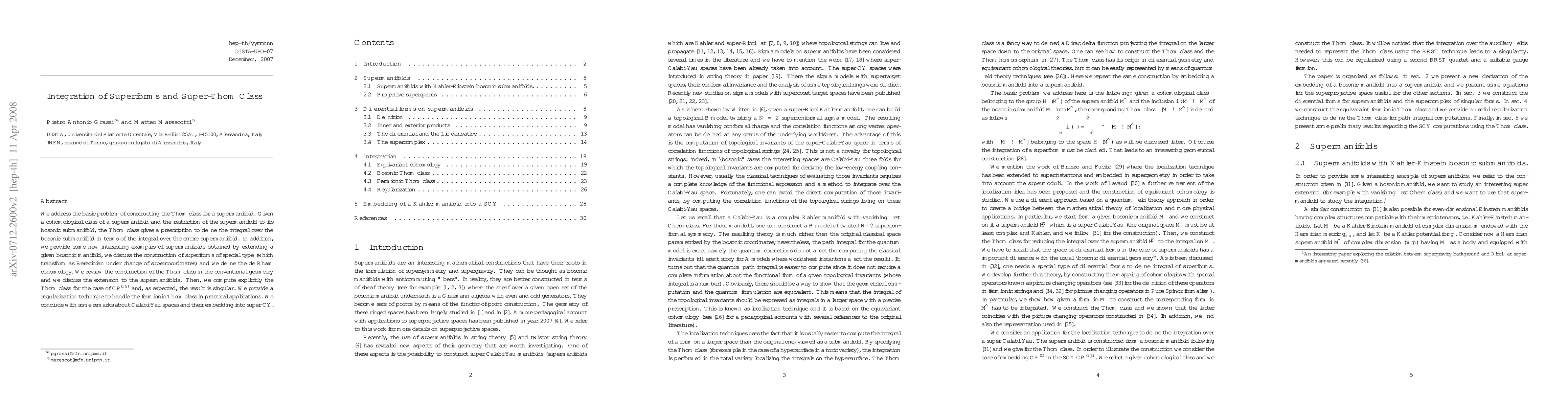 We address the basic problem of constructing the Thom class for a supermanifold. Given a cohomological class of a supermanifold and the restriction of the supermanifold to its bosonic submanifold, the Thom class gives a prescription to define the integral over the bosonic submanifold in terms of the integral over the entire supermanifold. In addition, we provide some new interesting examples of supermanifolds obtained by extending a given bosonic manifold, we discuss the construction of superforms of special type (which transform as Berezinian under change of supercoordinates) and we define the de Rham cohomology. We review the construction of the Thom class in the conventional geometry and we discuss the extension to the supermanifolds. Then, we compute explicitly the Thom class for the case of CP^{(1|2)} and, as expected, the result is singular. We provide a regularization technique to handle the fermionic Thom class in practical applications. We conclude with some remarks about Calabi-Yau spaces and their embedding into super-CY.