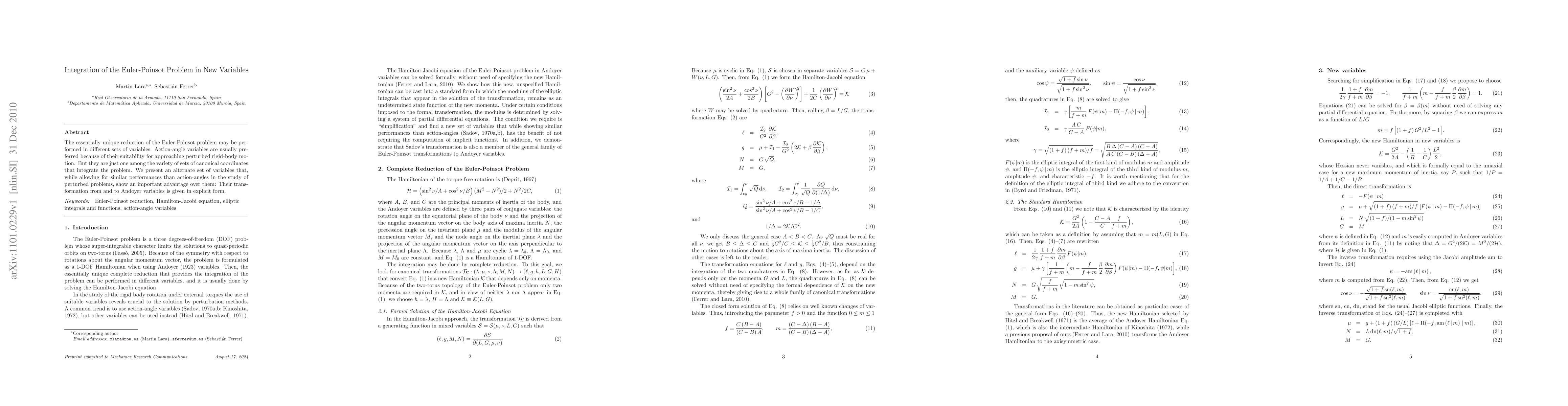 The essentially unique reduction of the Euler-Poinsot problem may be performed in different sets of variables. Action-angle variables are usually preferred because of their suitability for approaching perturbed rigid-body motion. But they are just one among the variety of sets of canonical coordinates that integrate the problem. We present an alternate set of variables that, while allowing for similar performances than action-angles in the study of perturbed problems, show an important advantage over them: Their transformation from and to Andoyer variables is given in explicit form.