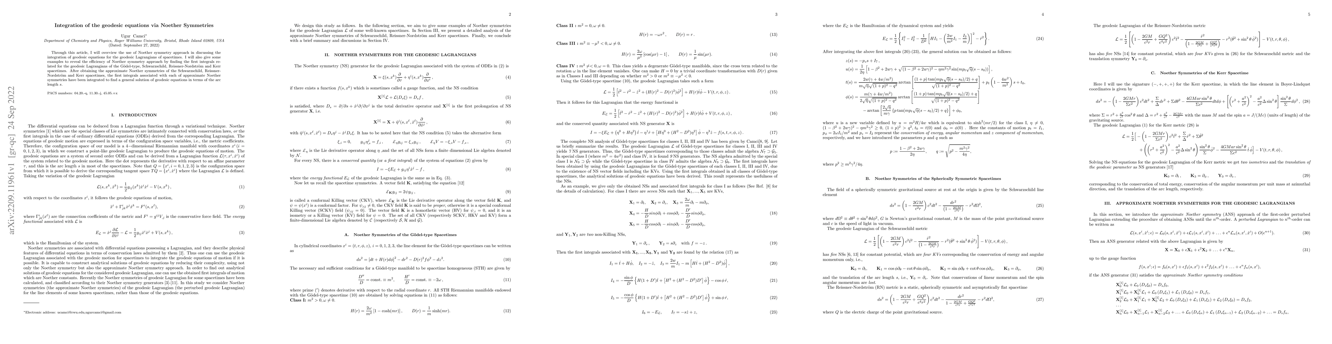 Through this article, I will overview the use of Noether symmetry approach in discussing the integration of geodesic equations for the geodesic Lagrangians of spacetimes. I will also give some examples to reveal the efficiency of Noether symmetry approach by finding the first integrals related for the geodesic Lagrangians of the G\"{o}del-type, Schwarzschild, Reissner-Nordstr\"{o}m and Kerr spacetimes. After obtaining the approximate Noether symmetries of the Schwarzschild, Reissner-Nordstr\"{o}m and Kerr spacetimes, the first integrals associated with each of approximate Noether symmetries have been integrated to find a general solution of geodesic equations in terms of the arc length $s$.