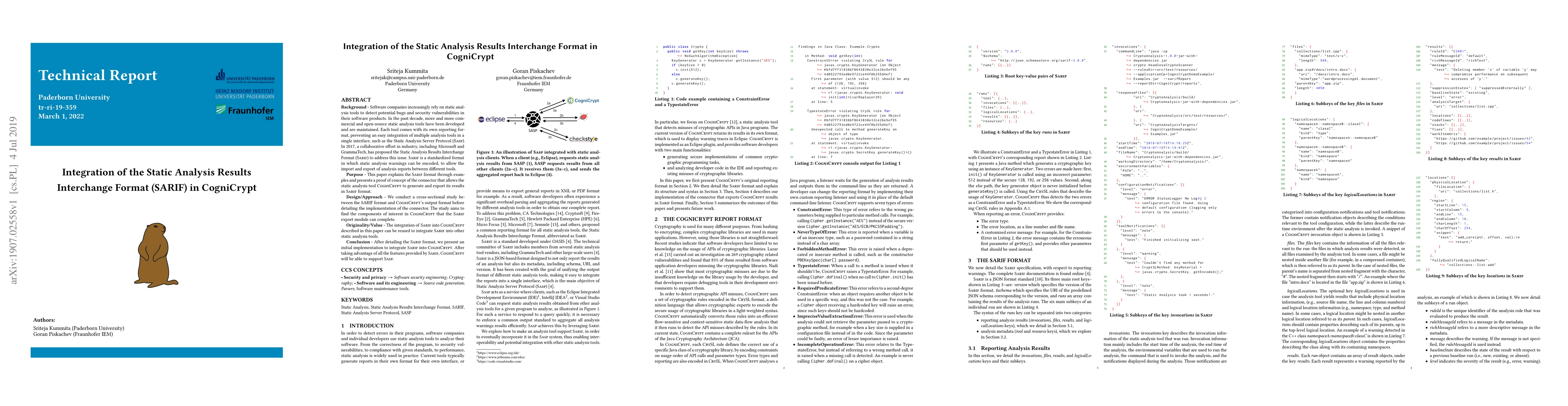 This paper explores the integration of the Static Analysis Results Interchange Format (SARIF) into CogniCrypt, a static analysis tool, to enable the export of analysis results in a standardized format. The study details the implementation of a connector that allows CogniCrypt to generate SARIF reports, facilitating the integration of multiple static analysis tools.