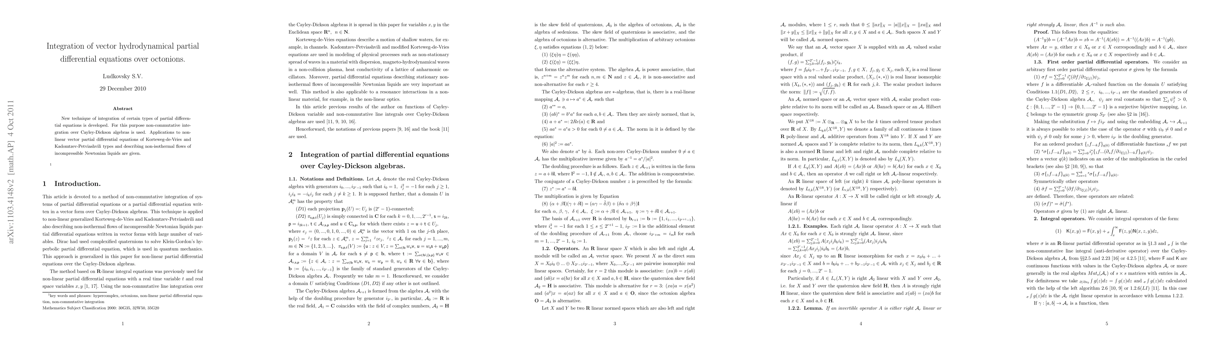 This paper introduces a novel technique for integrating vector hydrodynamical partial differential equations using non-commutative integration over Cayley-Dickson algebras. The method is applied to solve non-linear equations like Korteweg-de-Vries and Kadomtzev-Petviashvili, as well as to model non-isothermal flows of incompressible Newtonian liquids.