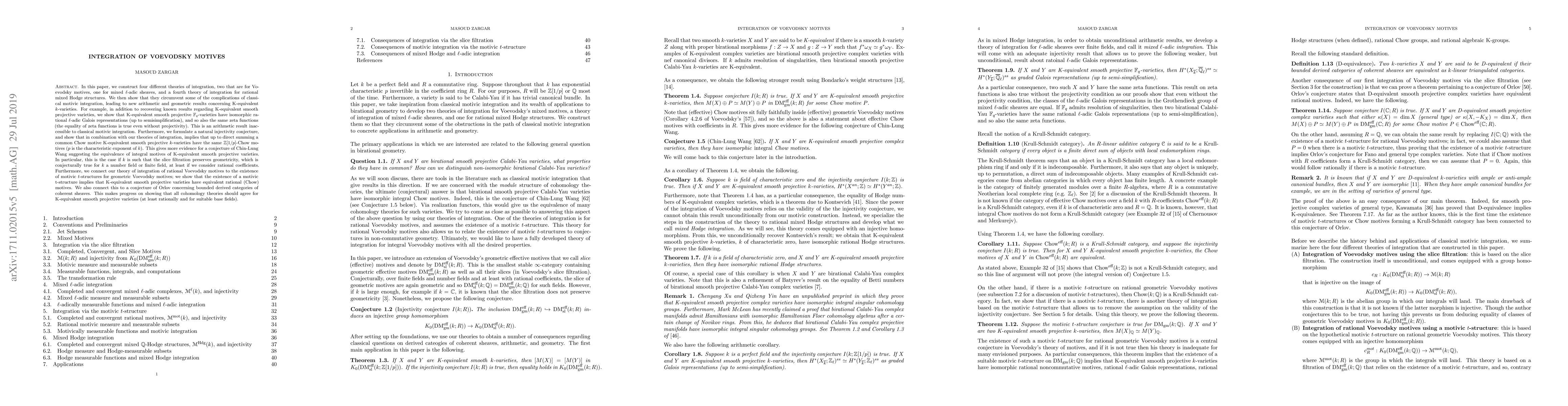 This paper constructs four integration theories for Voevodsky motives, mixed $\ell$-adic sheaves, and rational mixed Hodge structures, revealing new arithmetic and geometric results for K-equivalent $k$-varieties. It demonstrates that K-equivalent smooth projective $\mathbb{F}_q$-varieties share isomorphic rational $\ell$-adic Galois representations and zeta functions, providing evidence for Wang's conjecture on the equivalence of integral motives.