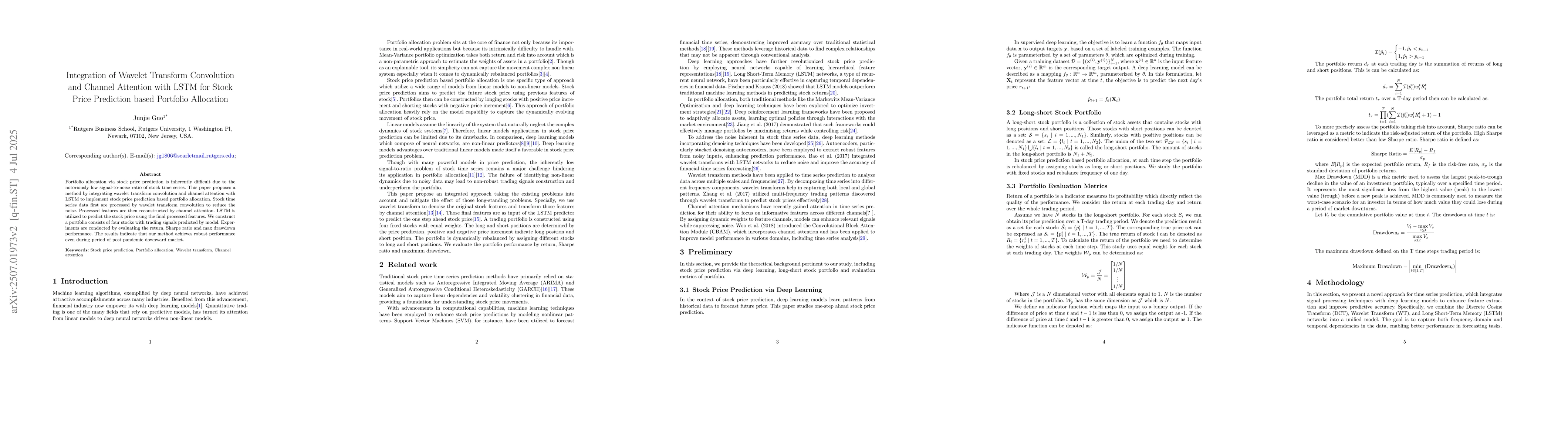 Portfolio allocation via stock price prediction is inherently difficult due to the notoriously low signal-to-noise ratio of stock time series. This paper proposes a method by integrating wavelet transform convolution and channel attention with LSTM to implement stock price prediction based portfolio allocation. Stock time series data first are processed by wavelet transform convolution to reduce the noise. Processed features are then reconstructed by channel attention. LSTM is utilized to predict the stock price using the final processed features. We construct a portfolio consists of four stocks with trading signals predicted by model. Experiments are conducted by evaluating the return, Sharpe ratio and max drawdown performance. The results indicate that our method achieves robust performance even during period of post-pandemic downward market.