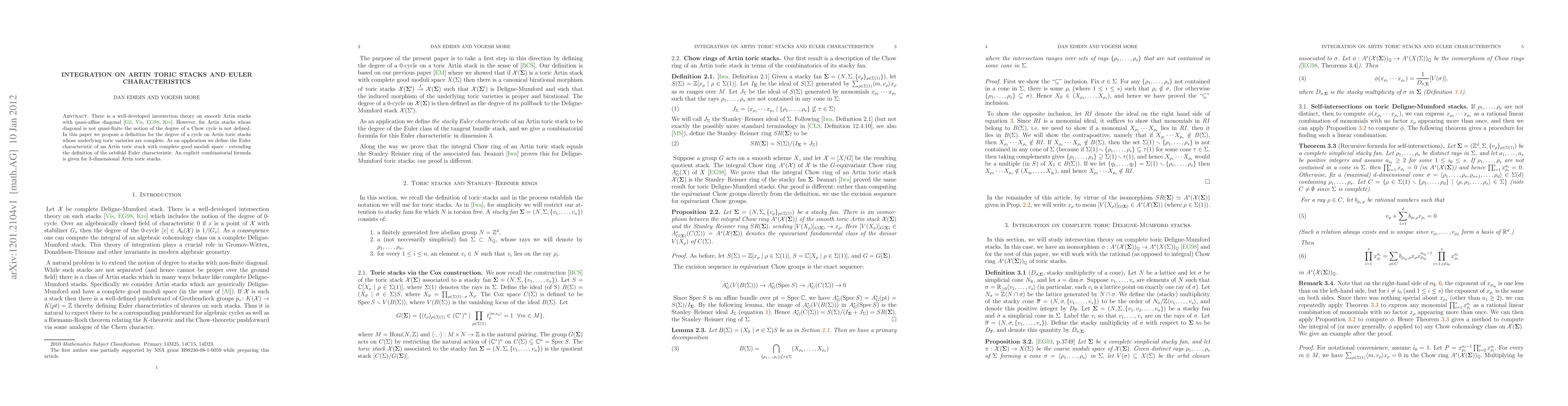This paper proposes a definition for the degree of cycles on Artin toric stacks with complete underlying toric varieties, extending the notion of the orbifold Euler characteristic. An explicit combinatorial formula for the Euler characteristic is provided for 3-dimensional Artin toric stacks.