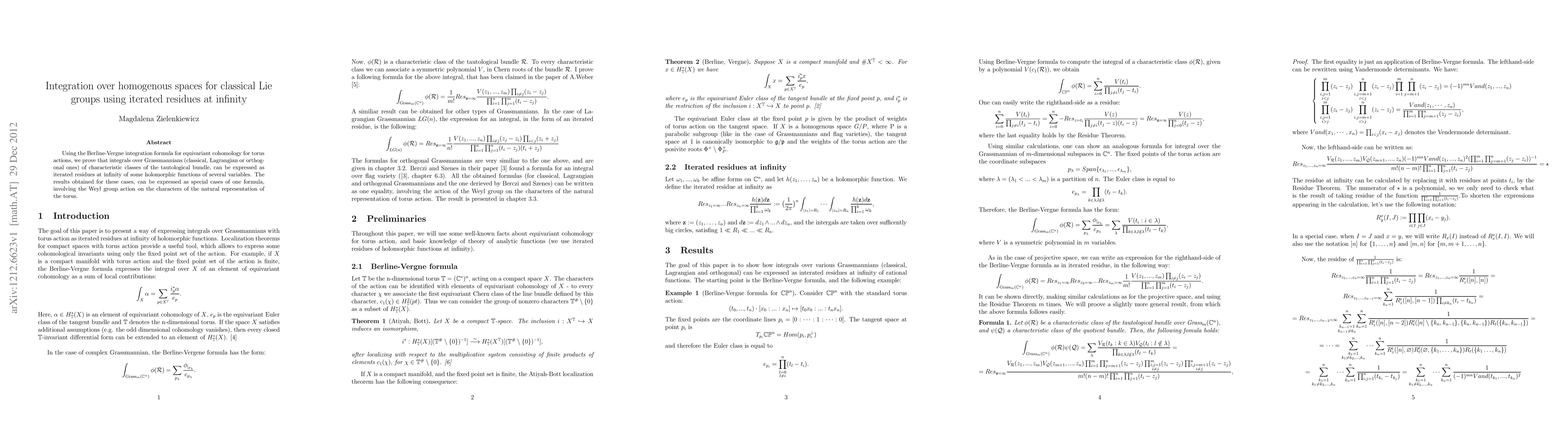 Using the Berline-Vergne integration formula for equivariant cohomology for torus actions, we prove that integrals over Grassmannians (classical, Lagrangian or orthogonal ones) of characteristic classes of the tautological bundle, can be expressed as iterated residues at infinity of some holomorphic functions of several variables. The results obtained for these cases, can be expressed as special cases of one formula, involving the Weyl group action on the characters of the natural representation of the torus.