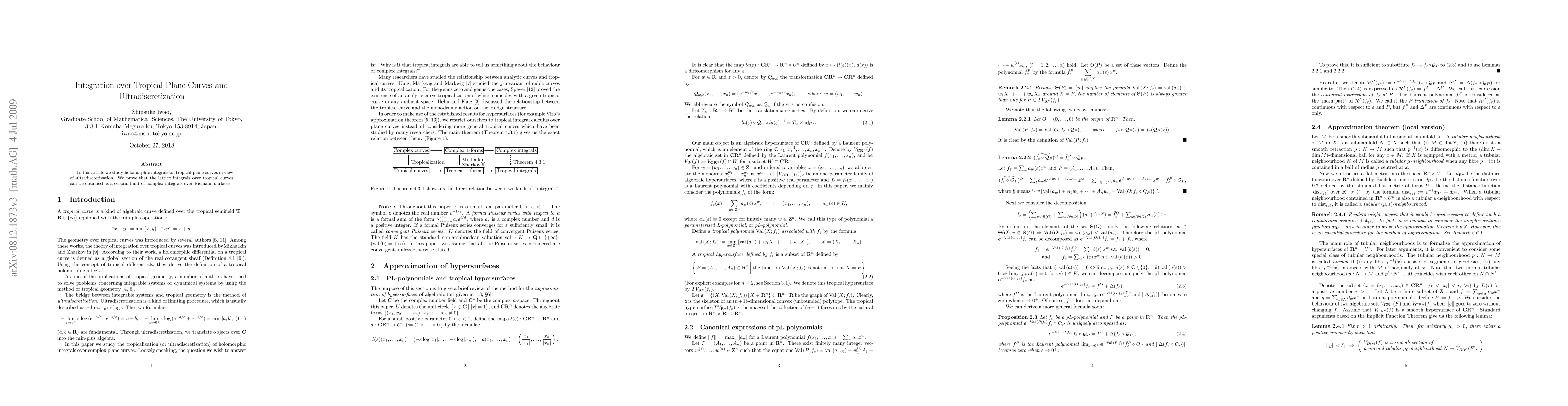 Summary: This paper investigates holomorphic integrals on tropical plane curves through the lens of ultradiscretization, demonstrating that lattice integrals over tropical curves converge to complex integrals over Riemannian surfaces as a specific limit is taken.