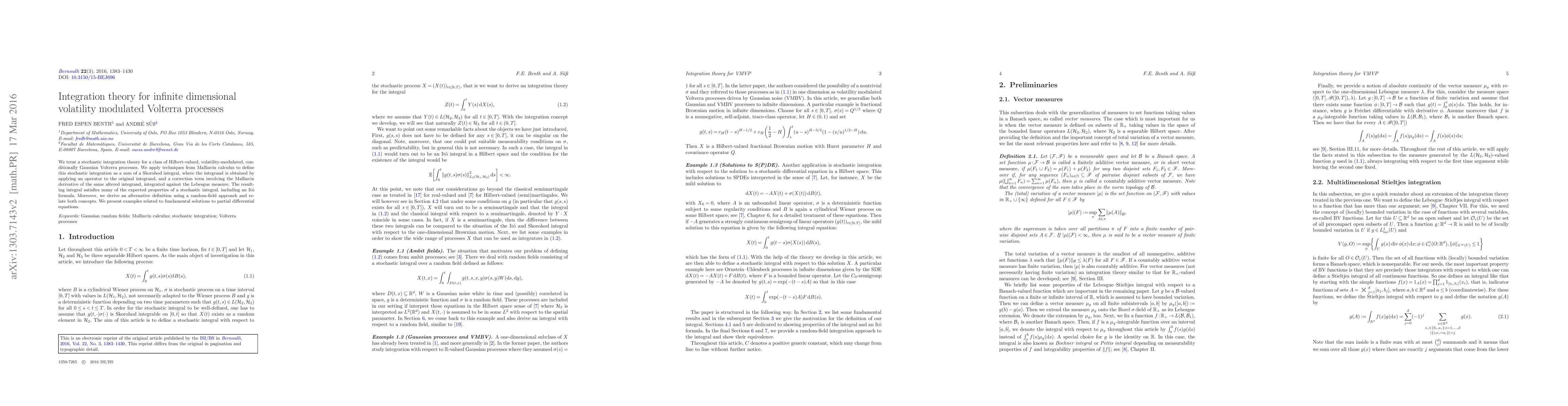We treat a stochastic integration theory for a class of Hilbert-valued, volatility-modulated, conditionally Gaussian Volterra processes. We apply techniques from Malliavin calculus to define this stochastic integration as a sum of a Skorohod integral, where the integrand is obtained by applying an operator to the original integrand, and a correction term involving the Malliavin derivative of the same altered integrand, integrated against the Lebesgue measure. The resulting integral satisfies many of the expected properties of a stochastic integral, including an It\^{o} formula. Moreover, we derive an alternative definition using a random-field approach and relate both concepts. We present examples related to fundamental solutions to partial differential equations.