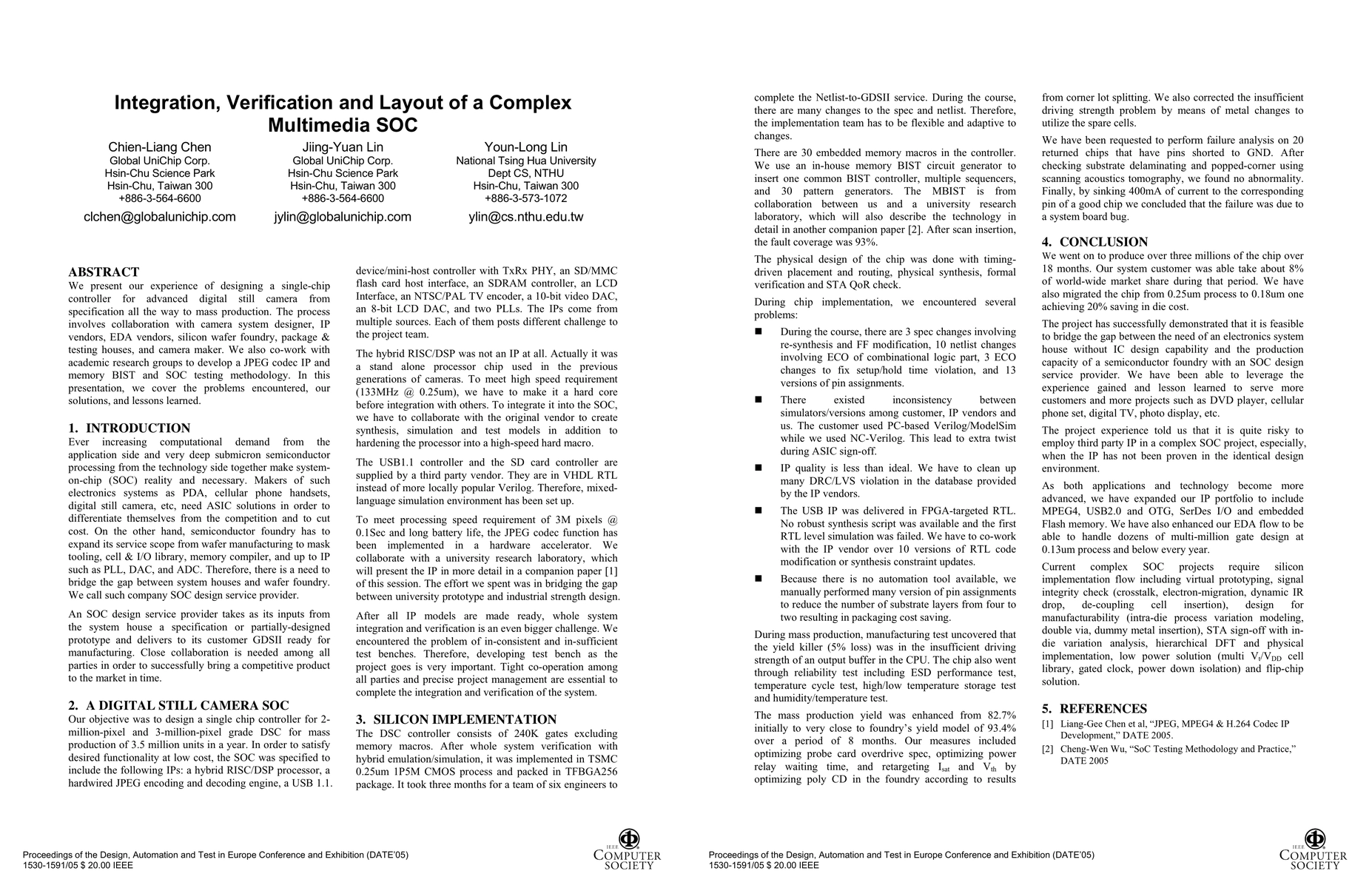 We present our experience of designing a single-chip controller for advanced digital still camera from specification all the way to mass production. The process involves collaboration with camera system designer, IP vendors, EDA vendors, silicon wafer foundry, package and testing houses, and camera maker. We also co-work with academic research groups to develop a JPEG codec IP and memory BIST and SOC testing methodology. In this presentation, we cover the problems encountered, our solutions, and lessons learned.