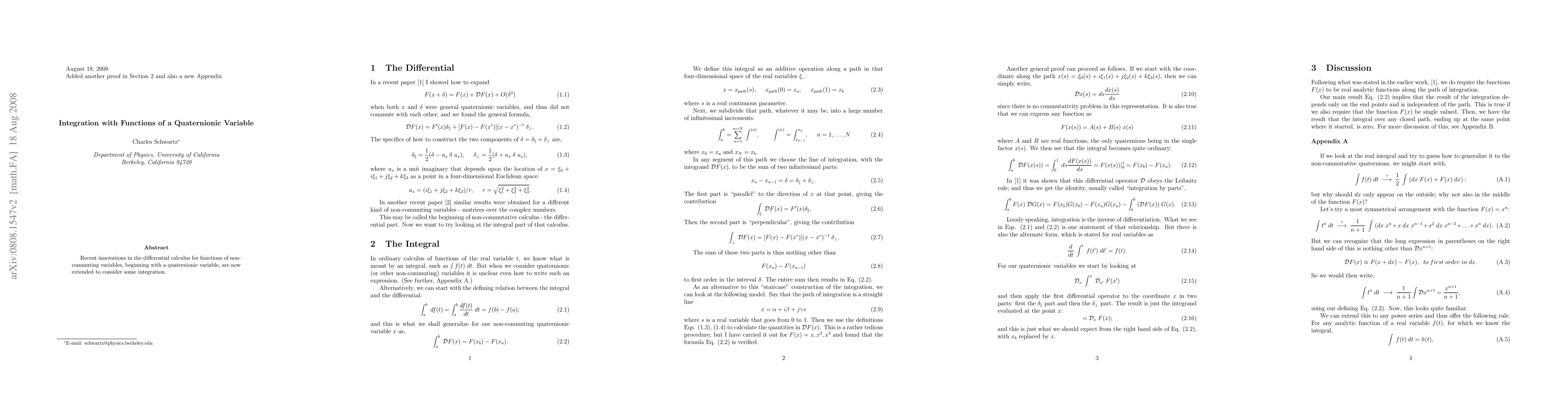 Recent innovations in the differential calculus for functions of non-commuting variables, beginning with a quaternionic variable, are now extended to consider some integration.