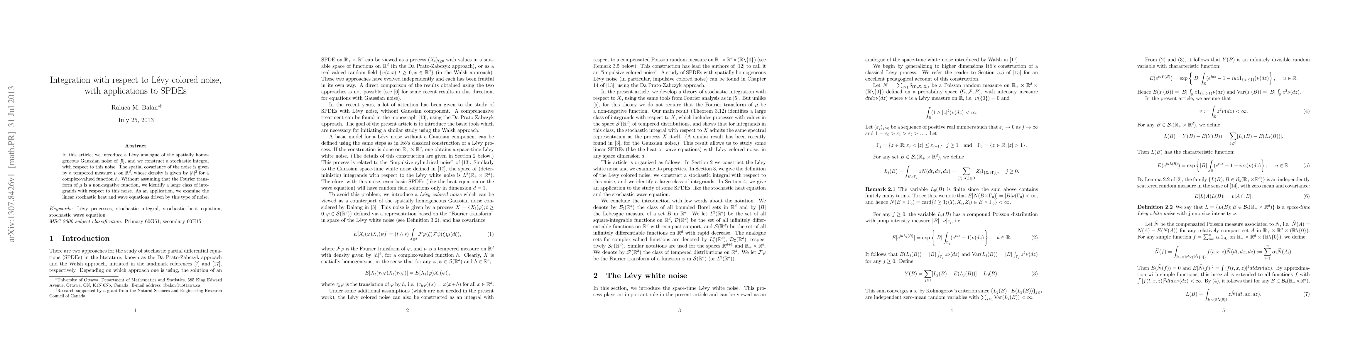 In this article, we introduce a L\'evy analogue of the spatially homogeneous Gaussian noise of Dalang (1999), and we construct a stochastic integral with respect to this noise. The spatial covariance of the noise is given by a tempered measure $\mu$ on $\bR^d$, whose density is given by $|h|^2$ for a complex-valued function $h$. Without assuming that the Fourier transform of $\mu$ is a non-negative function, we identify a large class of integrands with respect to this noise. As an application, we examine the linear stochastic heat and wave equations driven by this type of noise.