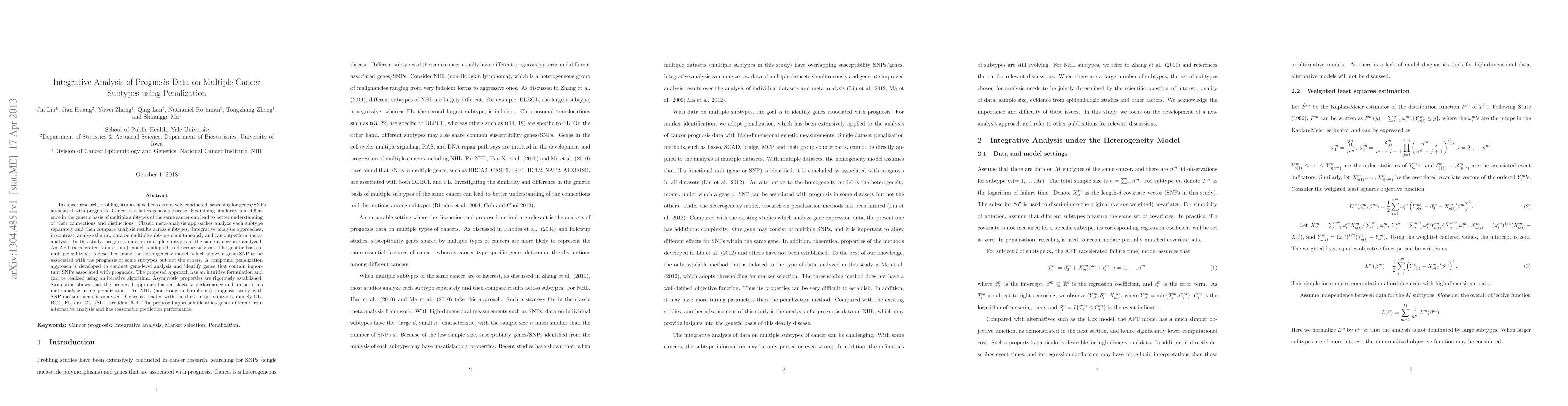 This study develops an integrative analysis approach using a compound penalization method to analyze prognosis data across multiple cancer subtypes simultaneously, identifying genes associated with survival outcomes. The proposed method outperforms traditional meta-analysis and successfully identifies distinct genetic factors in non-Hodgkin lymphoma subtypes.