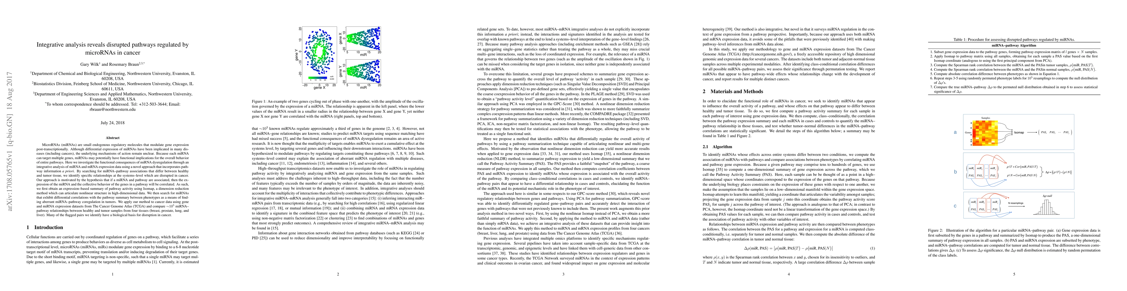 This research employs an integrative analysis of miRNA and mRNA expression data to identify disrupted pathways in cancer regulated by miRNAs. By correlating miRNA expression with pathway activity summaries derived from Isomap, the study reveals specific miRNA-pathway associations that differ between healthy and tumor tissues, highlighting systemic disruptions in cancer.