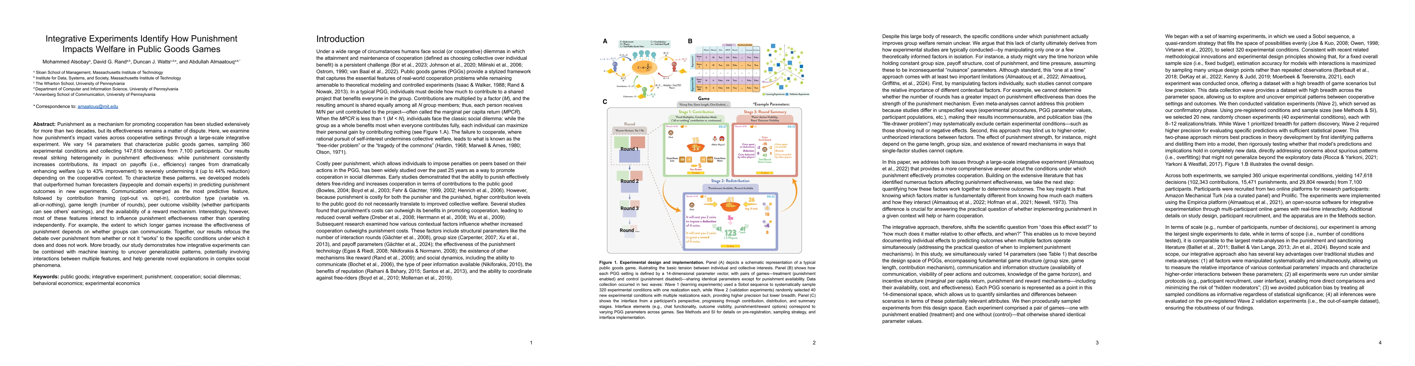 Punishment as a mechanism for promoting cooperation has been studied extensively for more than two decades, but its effectiveness remains a matter of dispute. Here, we examine how punishment's impact varies across cooperative settings through a large-scale integrative experiment. We vary 14 parameters that characterize public goods games, sampling 360 experimental conditions and collecting 147,618 decisions from 7,100 participants. Our results reveal striking heterogeneity in punishment effectiveness: while punishment consistently increases contributions, its impact on payoffs (i.e., efficiency) ranges from dramatically enhancing welfare (up to 43% improvement) to severely undermining it (up to 44% reduction) depending on the cooperative context. To characterize these patterns, we developed models that outperformed human forecasters (laypeople and domain experts) in predicting punishment outcomes in new experiments. Communication emerged as the most predictive feature, followed by contribution framing (opt-out vs. opt-in), contribution type (variable vs. all-or-nothing), game length (number of rounds), peer outcome visibility (whether participants can see others' earnings), and the availability of a reward mechanism. Interestingly, however, most of these features interact to influence punishment effectiveness rather than operating independently. For example, the extent to which longer games increase the effectiveness of punishment depends on whether groups can communicate. Together, our results refocus the debate over punishment from whether or not it "works" to the specific conditions under which it does and does not work. More broadly, our study demonstrates how integrative experiments can be combined with machine learning to uncover generalizable patterns, potentially involving interactions between multiple features, and help generate novel explanations in complex social phenomena.