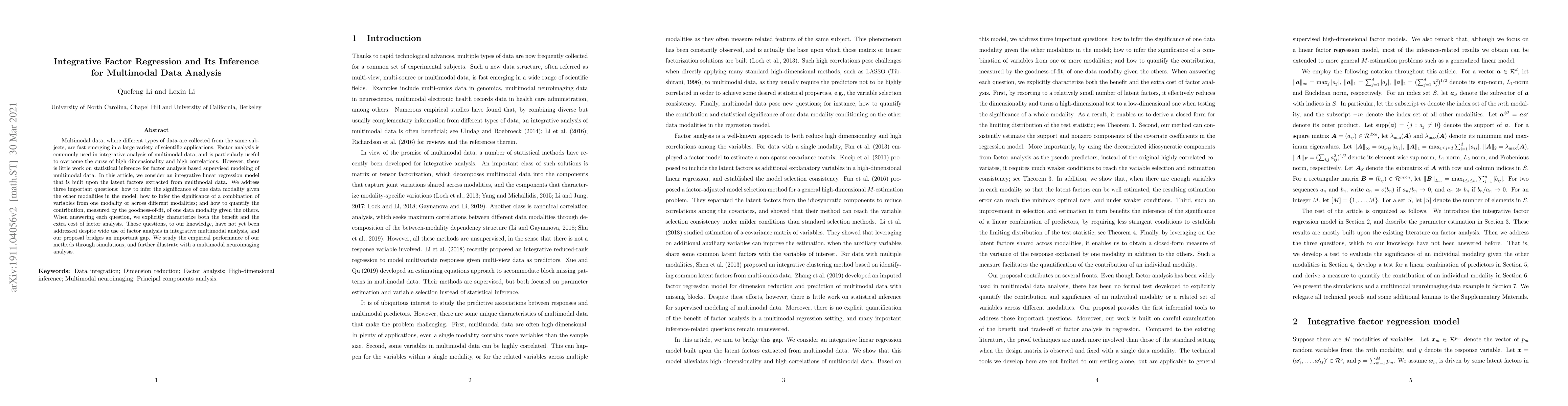 This paper proposes an integrative linear regression model based on latent factors extracted from multimodal data to address statistical inference challenges in multimodal analysis. It focuses on inferring the significance of data modalities, combinations of variables, and their contributions to the model, filling a gap in existing factor analysis methods.