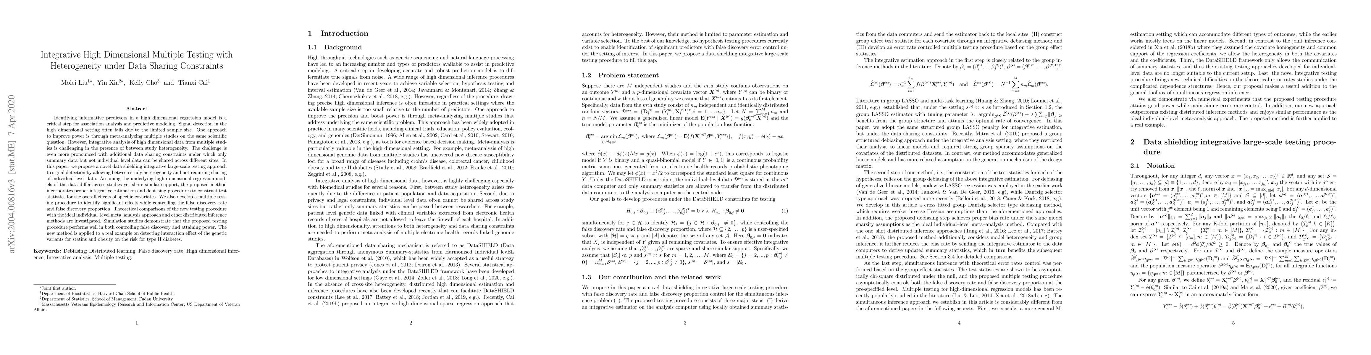 This paper proposes a novel DSILT approach for integrative high-dimensional multiple testing under data sharing constraints, addressing heterogeneity across studies without requiring individual-level data. The method effectively identifies significant predictors while controlling false discovery rates and is demonstrated to perform well through simulations and a real-world application in genetic variant interaction analysis.