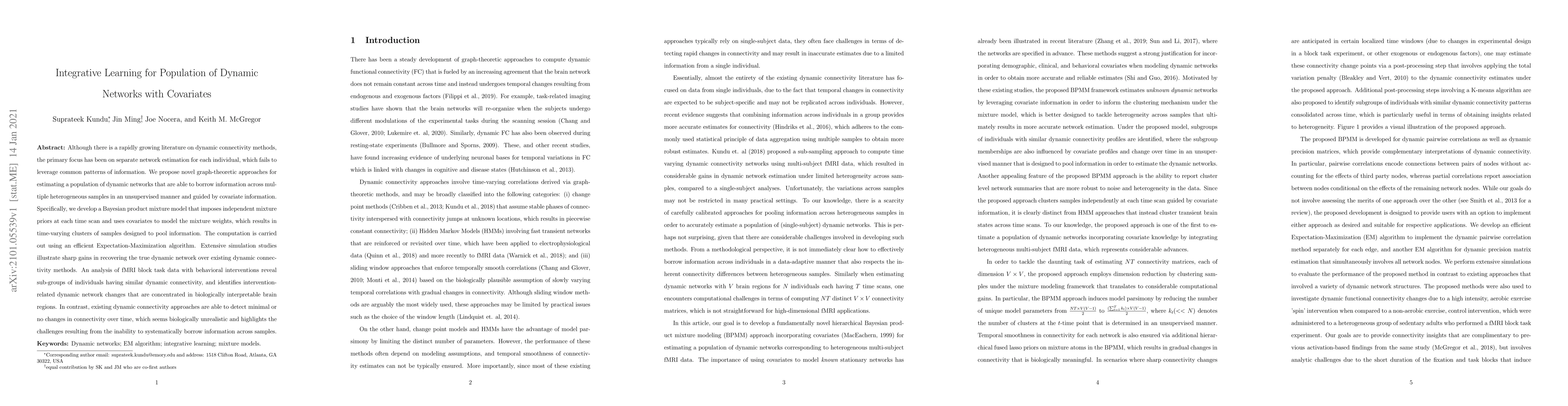 Although there is a rapidly growing literature on dynamic connectivity methods, the primary focus has been on separate network estimation for each individual, which fails to leverage common patterns of information. We propose novel graph-theoretic approaches for estimating a population of dynamic networks that are able to borrow information across multiple heterogeneous samples in an unsupervised manner and guided by covariate information. Specifically, we develop a Bayesian product mixture model that imposes independent mixture priors at each time scan and uses covariates to model the mixture weights, which results in time-varying clusters of samples designed to pool information. The computation is carried out using an efficient Expectation-Maximization algorithm. Extensive simulation studies illustrate sharp gains in recovering the true dynamic network over existing dynamic connectivity methods. An analysis of fMRI block task data with behavioral interventions reveal sub-groups of individuals having similar dynamic connectivity, and identifies intervention-related dynamic network changes that are concentrated in biologically interpretable brain regions. In contrast, existing dynamic connectivity approaches are able to detect minimal or no changes in connectivity over time, which seems biologically unrealistic and highlights the challenges resulting from the inability to systematically borrow information across samples.