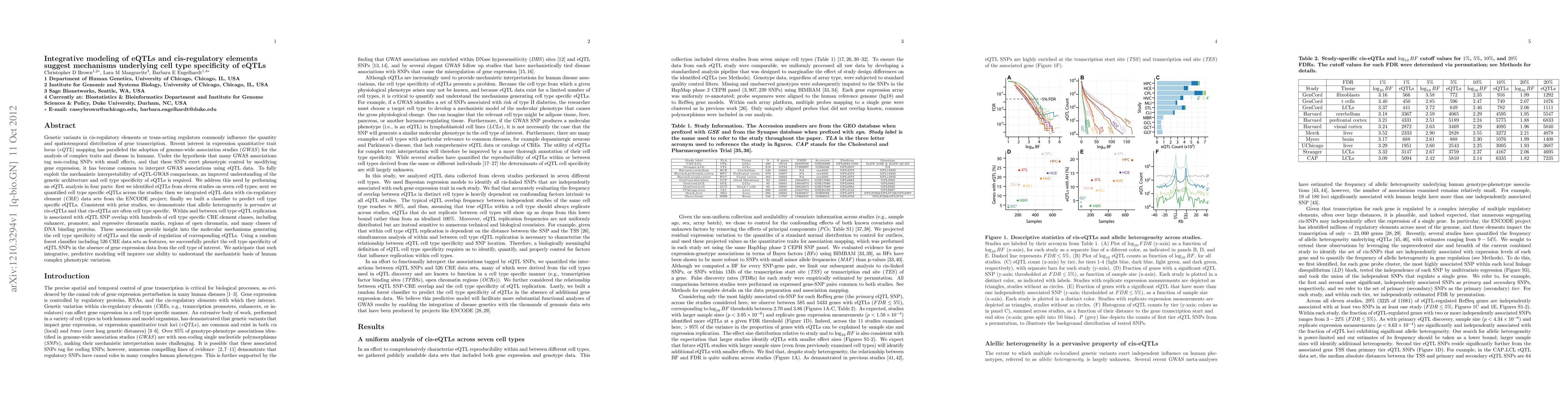 Genetic variants in cis-regulatory elements or trans-acting regulators commonly influence the quantity and spatiotemporal distribution of gene transcription. Recent interest in expression quantitative trait locus (eQTL) mapping has paralleled the adoption of genome-wide association studies (GWAS) for the analysis of complex traits and disease in humans. Under the hypothesis that many GWAS associations tag non-coding SNPs with small effects, and that these SNPs exert phenotypic control by modifying gene expression, it has become common to interpret GWAS associations using eQTL data. To exploit the mechanistic interpretability of eQTL-GWAS comparisons, an improved understanding of the genetic architecture and cell type specificity of eQTLs is required. We address this need by performing an eQTL analysis in four parts: first we identified eQTLs from eleven studies on seven cell types; next we quantified cell type specific eQTLs across the studies; then we integrated eQTL data with cis-regulatory element (CRE) data sets from the ENCODE project; finally we built a classifier to predict cell type specific eQTLs. Consistent with prior studies, we demonstrate that allelic heterogeneity is pervasive at cis-eQTLs and that cis-eQTLs are often cell type specific. Within and between cell type eQTL replication is associated with eQTL SNP overlap with hundreds of cell type specific CRE element classes, including enhancer, promoter, and repressive chromatin marks, regions of open chromatin, and many classes of DNA binding proteins. Using a random forest classifier including 526 CRE data sets as features, we successfully predict the cell type specificity of eQTL SNPs in the absence of gene expression data from the cell type of interest. We anticipate that such integrative, predictive modeling will improve our ability to understand the mechanistic basis of human complex phenotypic variation.