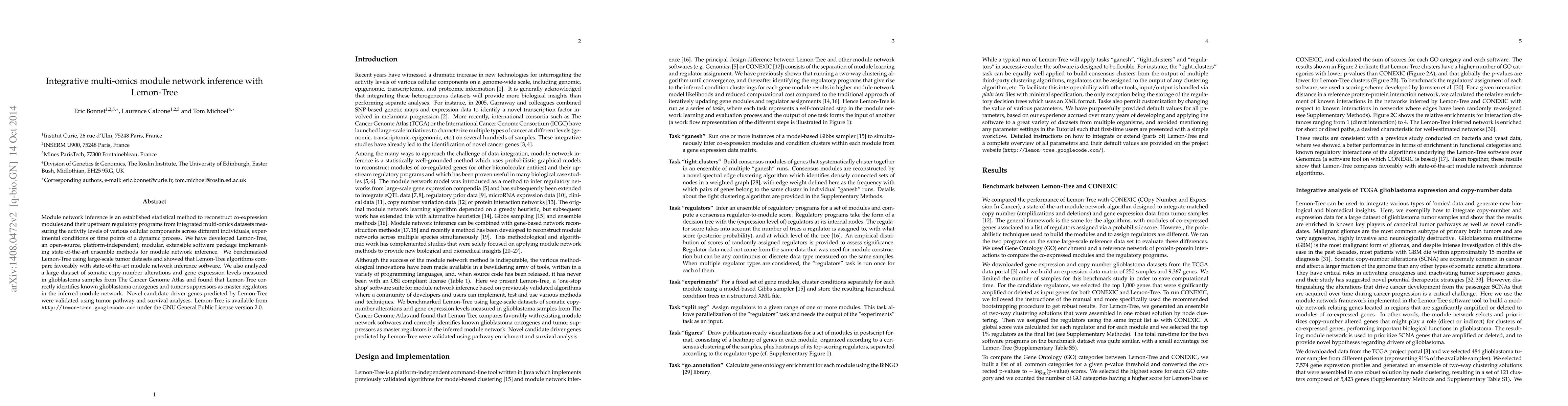 Lemon-Tree is a new software package for integrative multi-omics module network inference, which reconstructs co-expression modules and regulatory programs. Benchmarked on tumor datasets, it identifies known glioblastoma drivers and predicts novel candidates validated by pathway and survival analyses.