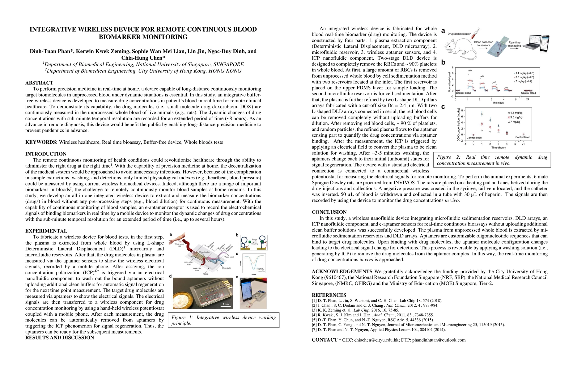 This study presents an integrative wireless device for continuous remote monitoring of drug concentrations in unprocessed blood, demonstrating its capability by measuring doxorubicin in live rats over 8 hours. The device aims to enable precision medicine and remote healthcare, potentially preventing pandemics through advanced remote diagnosis.