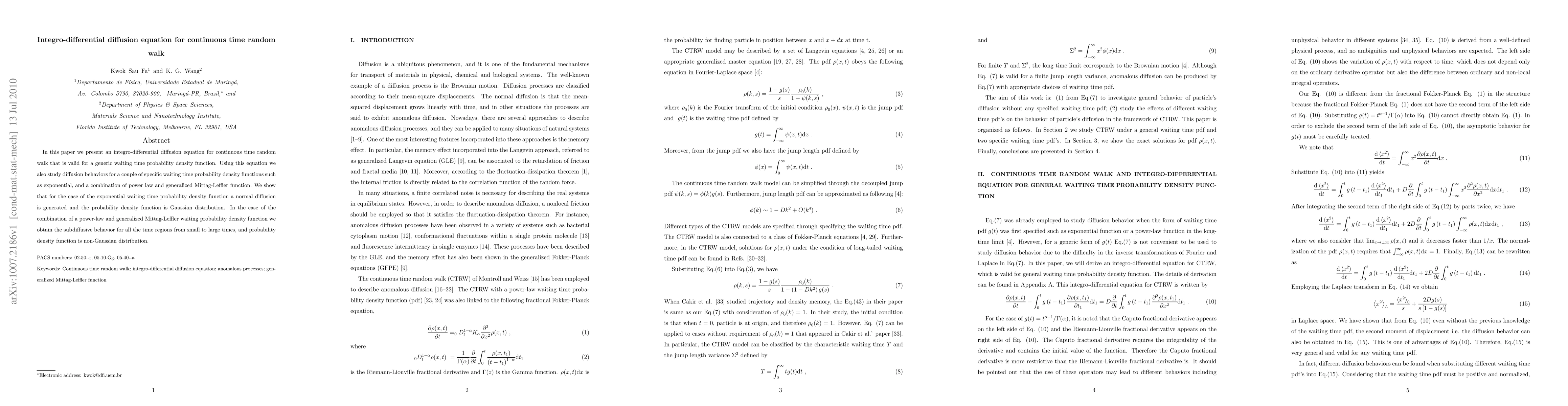 This paper develops an integro-differential diffusion equation for continuous time random walks applicable to various waiting time probability density functions. The study shows normal diffusion and Gaussian distribution for exponential waiting times, and subdiffusive behavior and non-Gaussian distribution for a combination of power-law and generalized Mittag-Leffler functions.