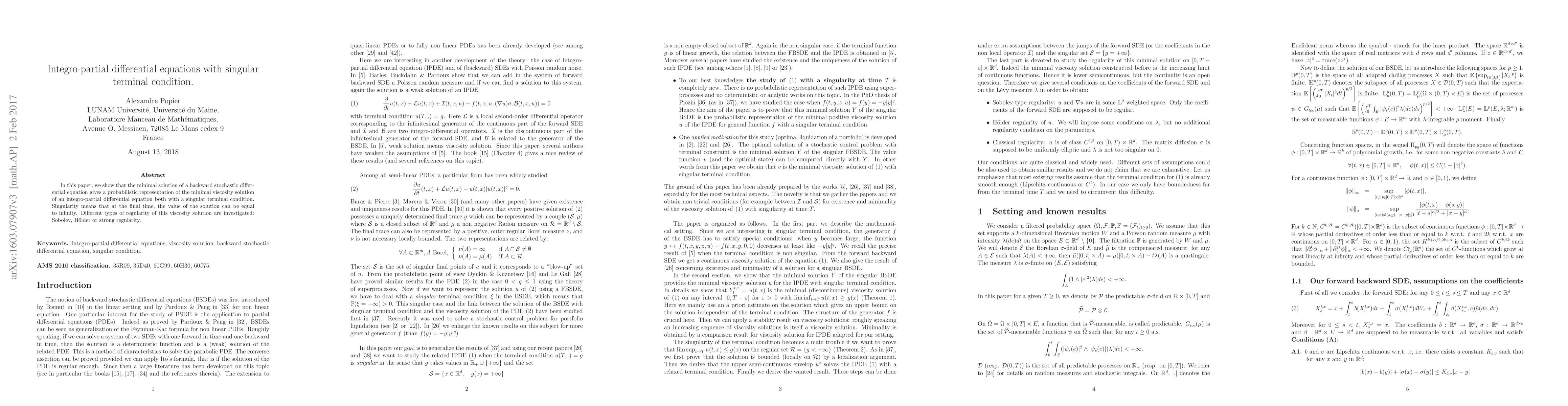 In this paper, we show that the minimal solution of a backward stochastic differential equation gives a probabilistic representation of the minimal viscosity solution of an integro-partial differential equation both with a singular terminal condition. Singularity means that at the final time, the value of the solution can be equal to infinity. Different types of regularity of this viscosity solution are investigated: Sobolev, H{\"o}lder or strong regularity.
