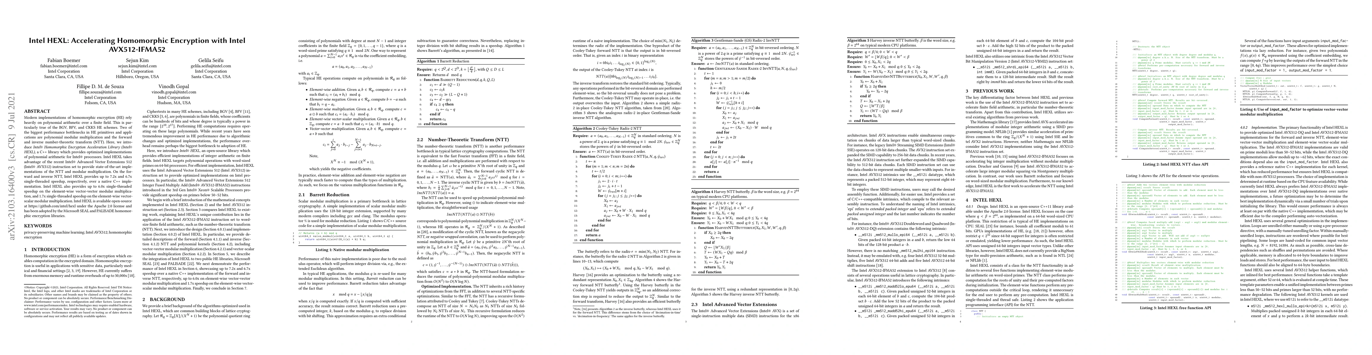 Intel HEXL accelerates homomorphic encryption schemes by optimizing polynomial arithmetic using Intel AVX512-IFMA52, achieving up to 7.2x speedup in forward and inverse NTT operations. The library is open-source and has been adopted by other homomorphic encryption libraries.