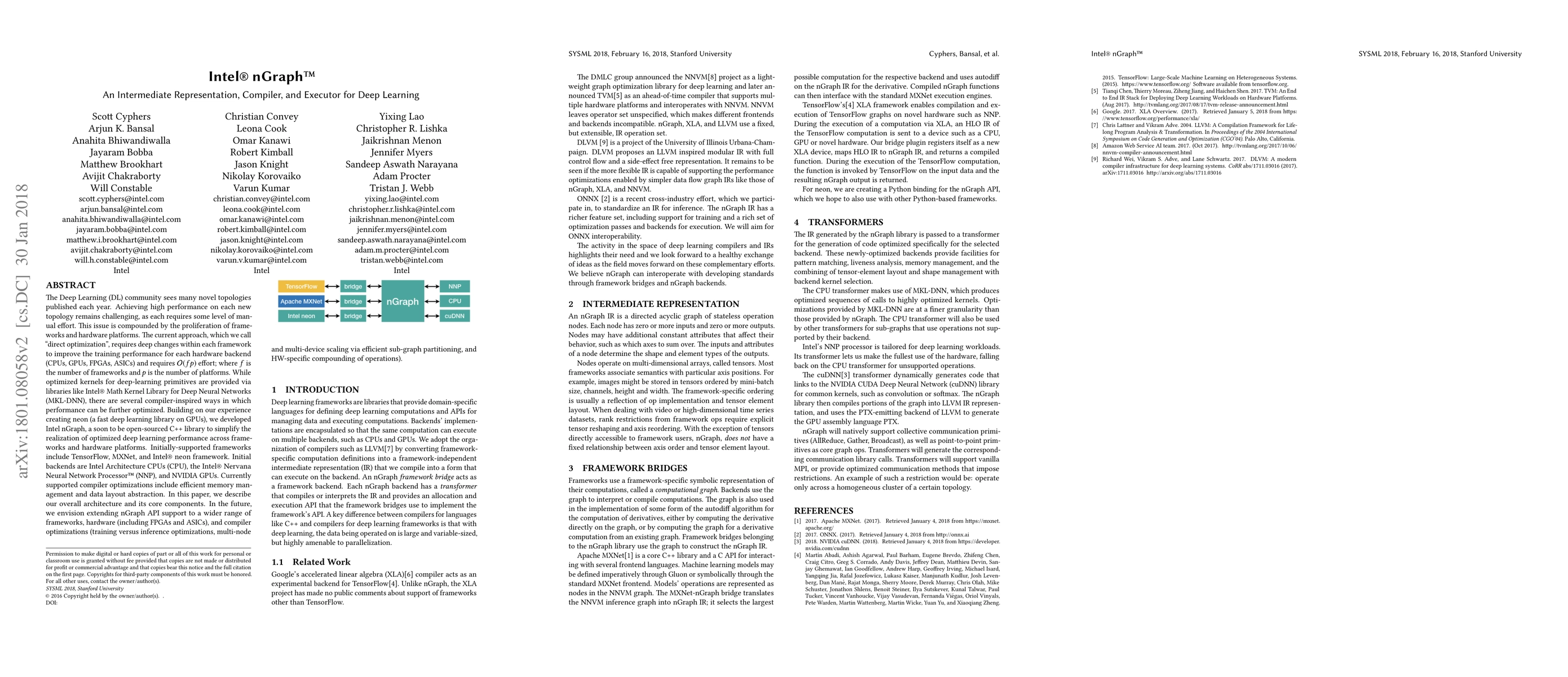 The Deep Learning (DL) community sees many novel topologies published each year. Achieving high performance on each new topology remains challenging, as each requires some level of manual effort. This issue is compounded by the proliferation of frameworks and hardware platforms. The current approach, which we call "direct optimization", requires deep changes within each framework to improve the training performance for each hardware backend (CPUs, GPUs, FPGAs, ASICs) and requires $\mathcal{O}(fp)$ effort; where $f$ is the number of frameworks and $p$ is the number of platforms. While optimized kernels for deep-learning primitives are provided via libraries like Intel Math Kernel Library for Deep Neural Networks (MKL-DNN), there are several compiler-inspired ways in which performance can be further optimized. Building on our experience creating neon (a fast deep learning library on GPUs), we developed Intel nGraph, a soon to be open-sourced C++ library to simplify the realization of optimized deep learning performance across frameworks and hardware platforms. Initially-supported frameworks include TensorFlow, MXNet, and Intel neon framework. Initial backends are Intel Architecture CPUs (CPU), the Intel(R) Nervana Neural Network Processor(R) (NNP), and NVIDIA GPUs. Currently supported compiler optimizations include efficient memory management and data layout abstraction. In this paper, we describe our overall architecture and its core components. In the future, we envision extending nGraph API support to a wider range of frameworks, hardware (including FPGAs and ASICs), and compiler optimizations (training versus inference optimizations, multi-node and multi-device scaling via efficient sub-graph partitioning, and HW-specific compounding of operations).