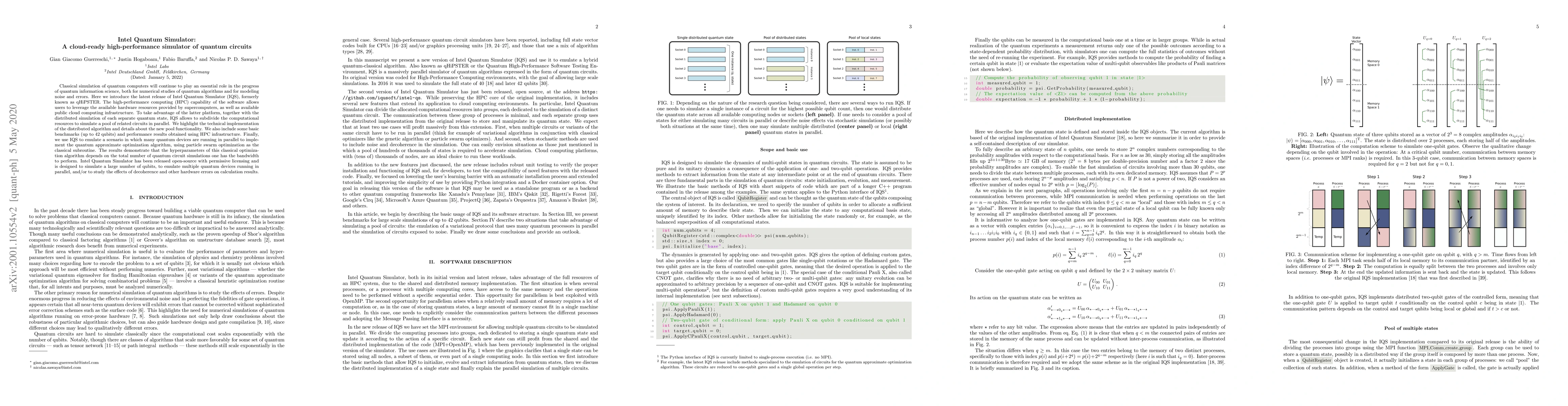 The Intel Quantum Simulator (IQS) is a high-performance cloud-ready tool for simulating quantum circuits, leveraging both supercomputers and public cloud resources. It features distributed algorithms to simulate multiple quantum circuits in parallel, with benchmarks showing performance up to 42 qubits.