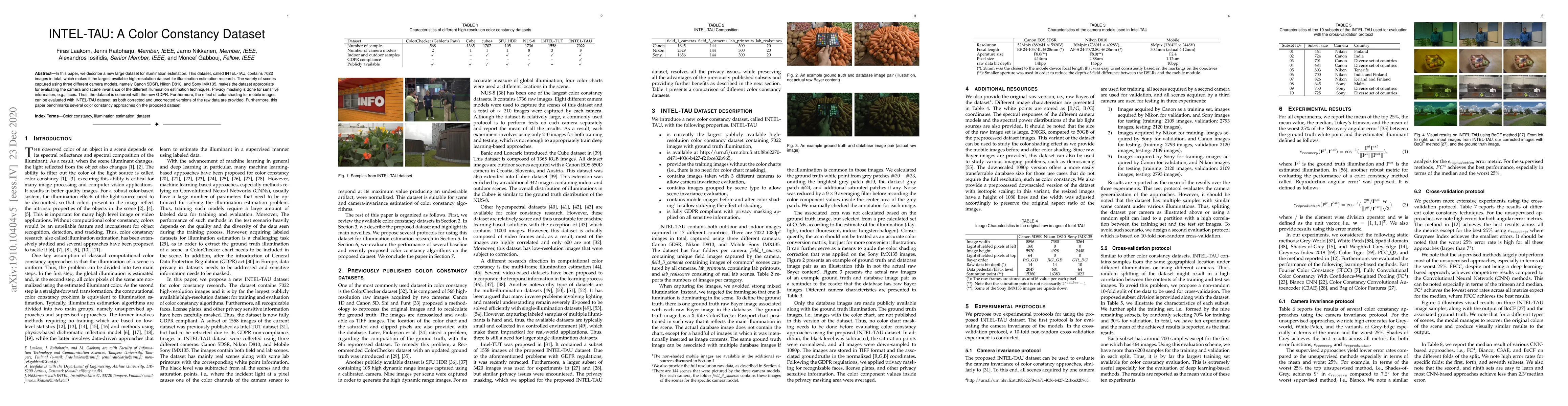 The INTEL-TAU dataset, comprising 7022 high-resolution images captured with three different camera models, is introduced for illumination estimation research, emphasizing camera and scene invariance. It includes both corrected and uncorrected raw data for evaluating color shading effects and complies with GDPR privacy regulations.