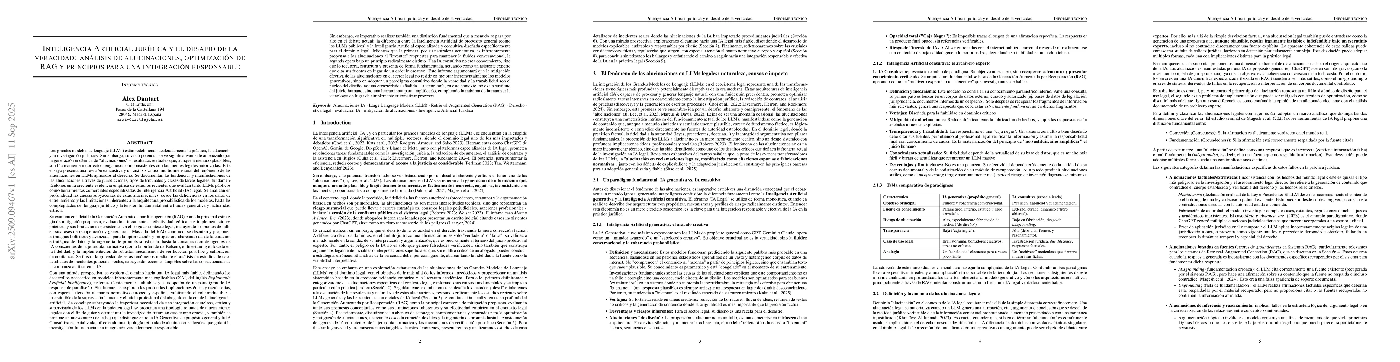This technical report analyzes the challenge of "hallucinations" (false information) in LLMs applied to law. It examines their causes, manifestations, and the effectiveness of the RAG mitigation strategy, highlighting its limitations and proposing holistic optimizations. The paper explores the ethical and regulatory implications, emphasizing human oversight as an irreplaceable role. It concludes that the solution lies not in incrementally improving generative models, but in adopting a "consultative" AI paradigm that prioritizes veracity and traceability, acting as a tool to amplify, not replace, professional judgment. -- Este informe t\'ecnico analiza el desaf\'io de las "alucinaciones" (informaci\'on falsa) en los LLMs aplicados al derecho. Se examinan sus causas, manifestaciones y la efectividad de la estrategia de mitigaci\'on RAG, exponiendo sus limitaciones y proponiendo optimizaciones hol\'isticas. Se exploran las implicaciones \'eticas y regulatorias, enfatizando la supervisi\'on humana como un rol insustituible. El documento concluye que la soluci\'on no reside en mejorar incrementalmente los modelos generativos, sino en adoptar un paradigma de IA "consultiva" que priorice la veracidad y la trazabilidad, actuando como una herramienta para amplificar, y no sustituir, el juicio profesional.
