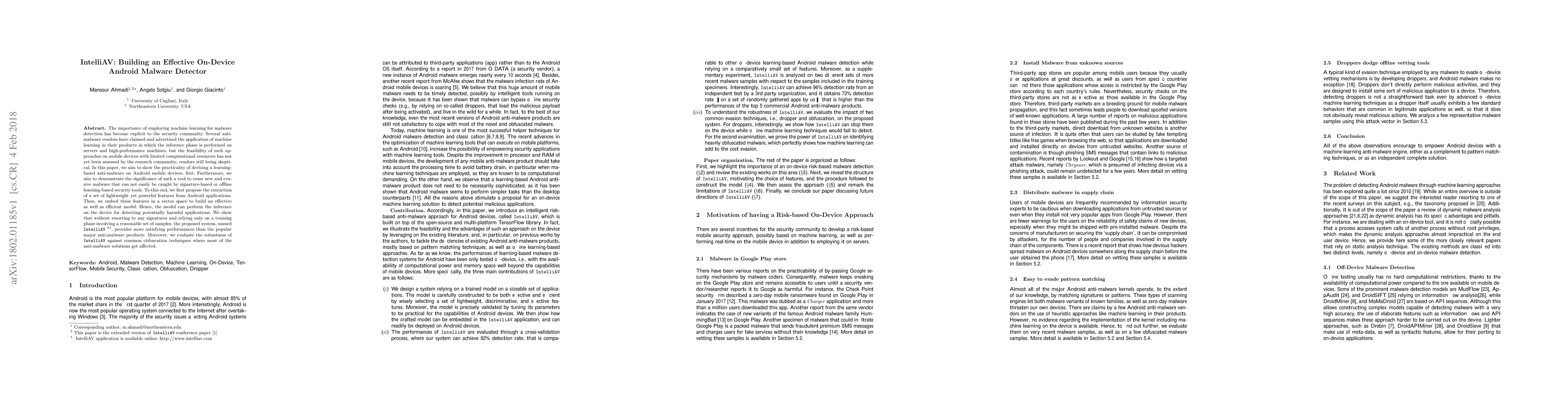 The importance of employing machine learning for malware detection has become explicit to the security community. Several anti-malware vendors have claimed and advertised the application of machine learning in their products in which the inference phase is performed on servers and high-performance machines, but the feasibility of such approaches on mobile devices with limited computational resources has not yet been assessed by the research community, vendors still being skeptical. In this paper, we aim to show the practicality of devising a learning-based anti-malware on Android mobile devices, first. Furthermore, we aim to demonstrate the significance of such a tool to cease new and evasive malware that can not easily be caught by signature-based or offline learning-based security tools. To this end, we first propose the extraction of a set of lightweight yet powerful features from Android applications. Then, we embed these features in a vector space to build an effective as well as efficient model. Hence, the model can perform the inference on the device for detecting potentially harmful applications. We show that without resorting to any signatures and relying only on a training phase involving a reasonable set of samples, the proposed system, named IntelliAV, provides more satisfying performances than the popular major anti-malware products. Moreover, we evaluate the robustness of IntelliAV against common obfuscation techniques where most of the anti-malware solutions get affected.