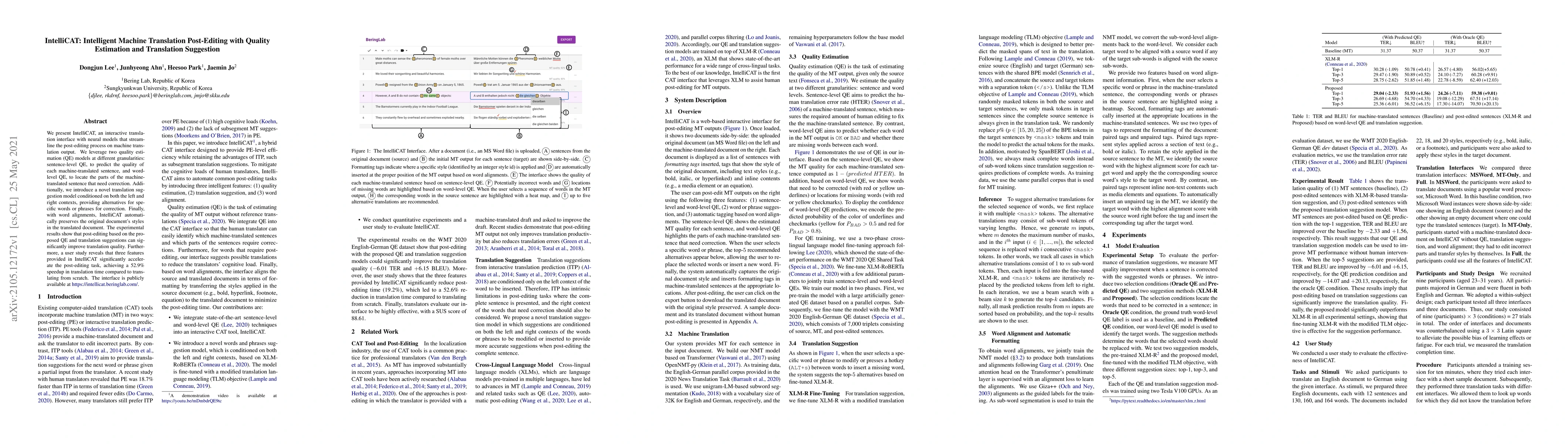 IntelliCAT is an interactive translation tool that uses neural models to enhance post-editing of machine translation outputs. It employs sentence-level and word-level quality estimation models, along with context-aware translation suggestions, to improve translation quality and speed up the editing process by 52.9%.