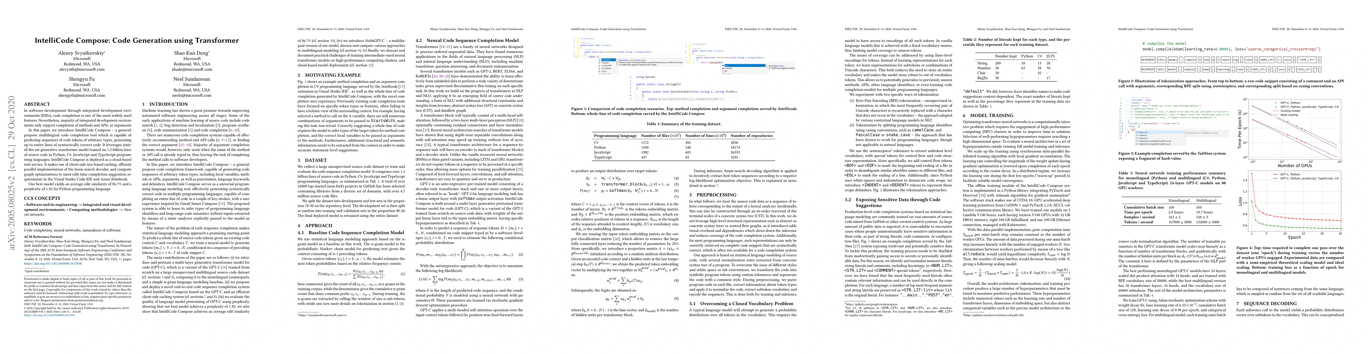 This paper introduces IntelliCode Compose, a multilingual code completion tool that predicts sequences of code tokens to generate entire lines of syntactically correct code. It uses a transformer model trained on 1.2 billion lines of Python, C#, JavaScript, and TypeScript code, achieving an average edit similarity of 86.7% for Python.