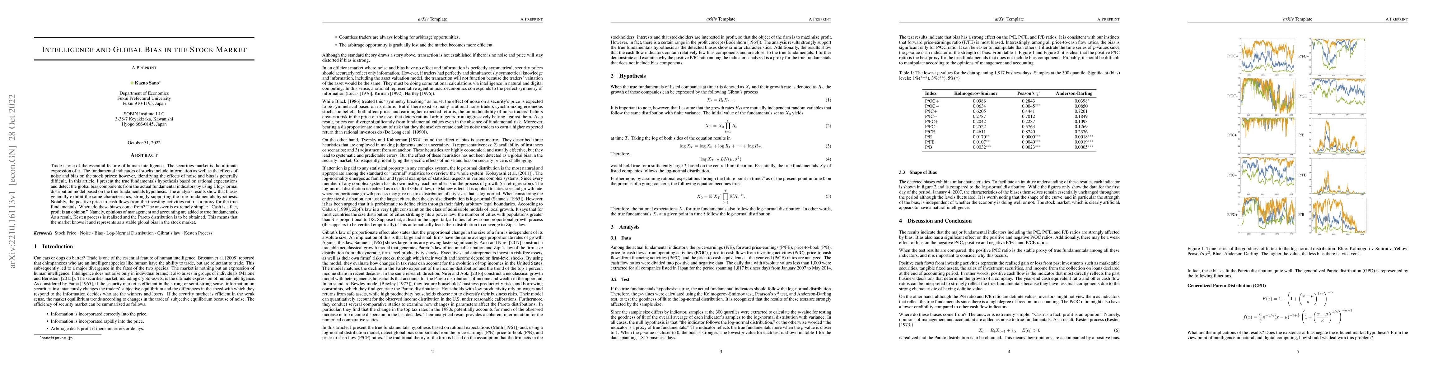 Trade is one of the essential feature of human intelligence. The securities market is the ultimate expression of it. The fundamental indicators of stocks include information as well as the effects of noise and bias on the stock prices; however, identifying the effects of noise and bias is generally difficult. In this article, I present the true fundamentals hypothesis based on rational expectations and detect the global bias components from the actual fundamental indicators by using a log-normal distribution model based on the true fundamentals hypothesis. The analysis results show that biases generally exhibit the same characteristics, strongly supporting the true fundamentals hypothesis. Notably, the positive price-to-cash flows from the investing activities ratio is a proxy for the true fundamentals. Where do these biases come from? The answer is extremely simple: ``Cash is a fact, profit is an opinion.'' Namely, opinions of management and accounting are added to true fundamentals. As a result, Kesten process is realized and the Pareto distribution is to be obtained. This means that the market knows it and represents as a stable global bias in the stock market.