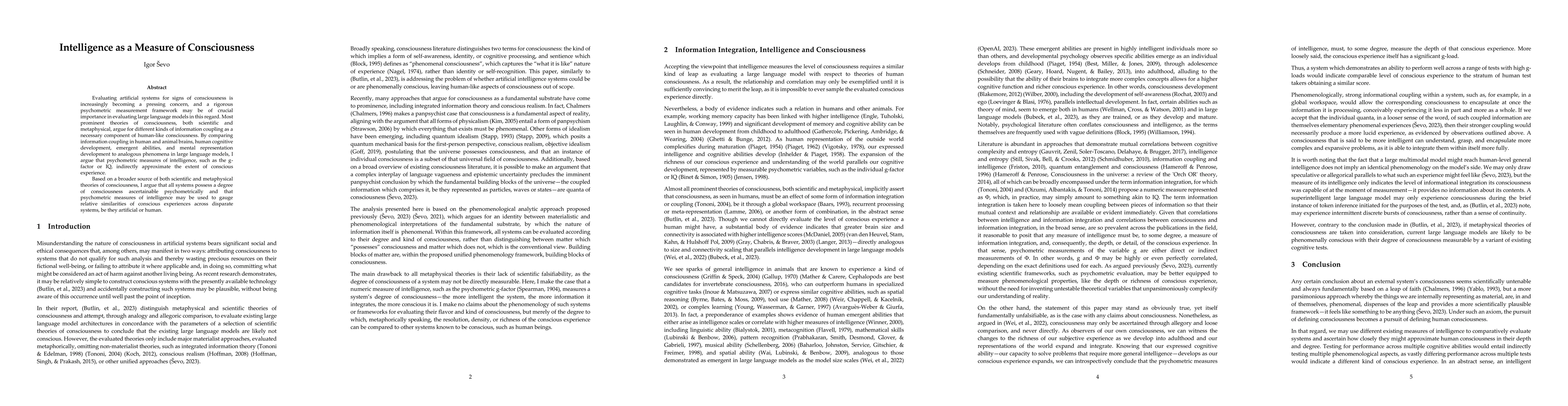 This paper argues that intelligence measures like the g-factor or IQ can indirectly assess the extent of consciousness in artificial systems, drawing parallels between information coupling in human brains and large language models. It posits that psychometric measures of intelligence can gauge relative similarities of conscious experiences across different systems.