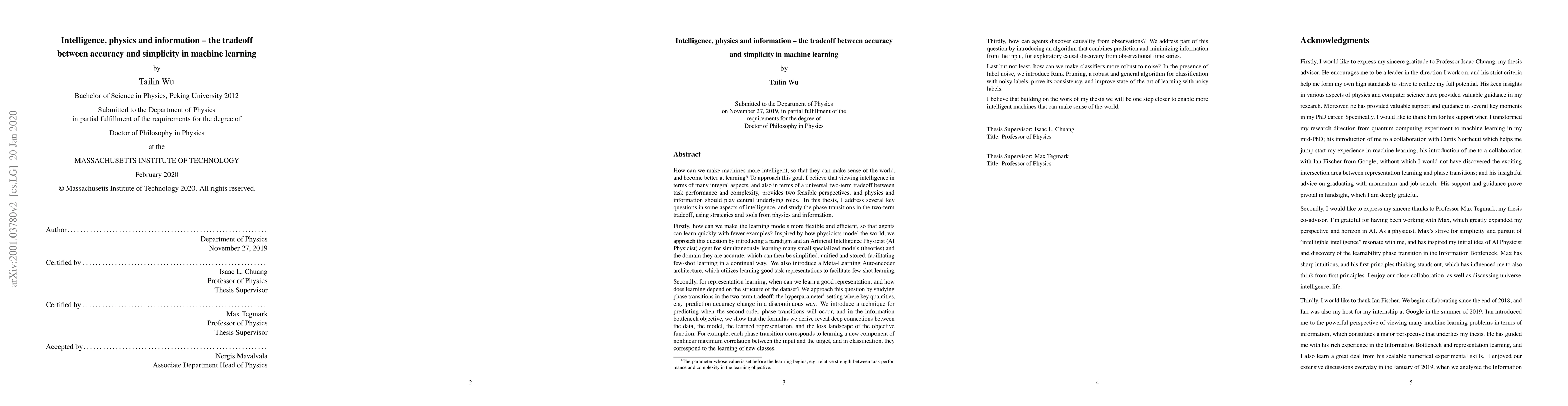 How can we enable machines to make sense of the world, and become better at learning? To approach this goal, I believe viewing intelligence in terms of many integral aspects, and also a universal two-term tradeoff between task performance and complexity, provides two feasible perspectives. In this thesis, I address several key questions in some aspects of intelligence, and study the phase transitions in the two-term tradeoff, using strategies and tools from physics and information. Firstly, how can we make the learning models more flexible and efficient, so that agents can learn quickly with fewer examples? Inspired by how physicists model the world, we introduce a paradigm and an AI Physicist agent for simultaneously learning many small specialized models (theories) and the domain they are accurate, which can then be simplified, unified and stored, facilitating few-shot learning in a continual way. Secondly, for representation learning, when can we learn a good representation, and how does learning depend on the structure of the dataset? We approach this question by studying phase transitions when tuning the tradeoff hyperparameter. In the information bottleneck, we theoretically show that these phase transitions are predictable and reveal structure in the relationships between the data, the model, the learned representation and the loss landscape. Thirdly, how can agents discover causality from observations? We address part of this question by introducing an algorithm that combines prediction and minimizing information from the input, for exploratory causal discovery from observational time series. Fourthly, to make models more robust to label noise, we introduce Rank Pruning, a robust algorithm for classification with noisy labels. I believe that building on the work of my thesis we will be one step closer to enable more intelligent machines that can make sense of the world.