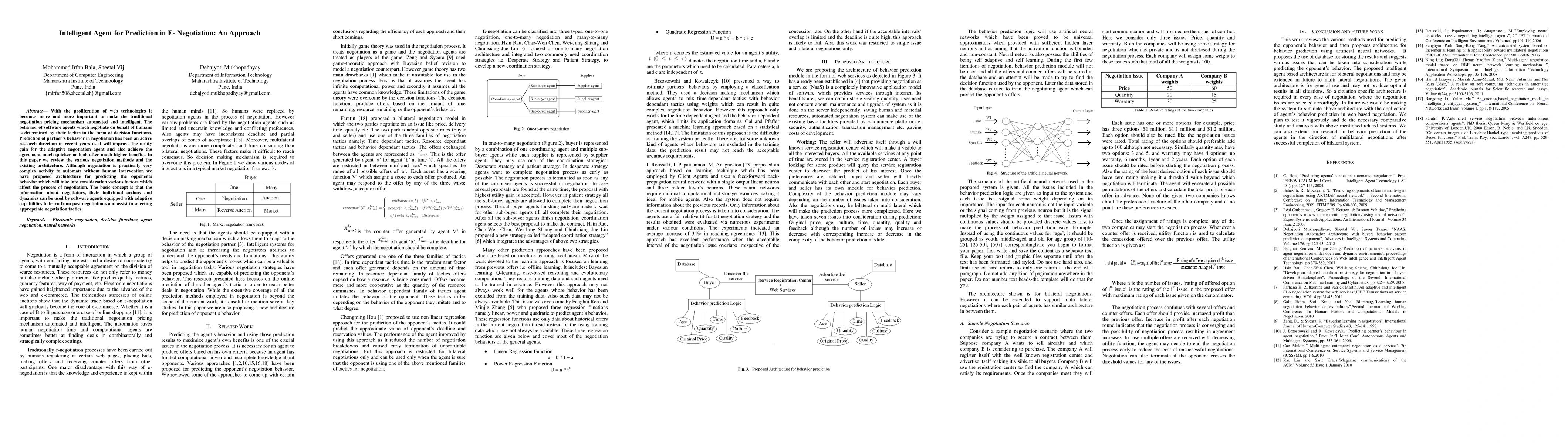 This paper proposes an intelligent agent architecture for automated e-negotiation, focusing on predicting negotiation partners' behavior to improve negotiation outcomes and efficiency. The architecture leverages historical data and adaptive learning to select optimal negotiation tactics.
