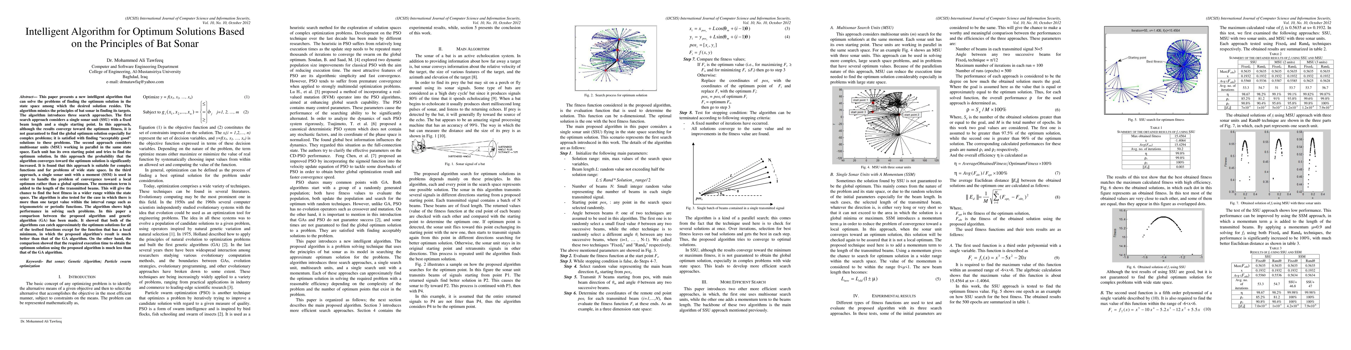 This paper presents a new intelligent algorithm that can solve the problems of finding the optimum solution in the state space among which the desired solution resides. The algorithm mimics the principles of bat sonar in finding its targets. The algorithm introduces three search approaches. The first search approach considers a single sonar unit (SSU) with a fixed beam length and a single starting point. In this approach, although the results converge toward the optimum fitness, it is not guaranteed to find the global optimum solution especially for complex problems; it is satisfied with finding 'acceptably good' solutions to these problems. The second approach considers multisonar units (MSU) working in parallel in the same state space. Each unit has its own starting point and tries to find the optimum solution. In this approach the probability that the algorithm converges toward the optimum solution is significantly increased. It is found that this approach is suitable for complex functions and for problems of wide state space. In the third approach, a single sonar unit with a moment (SSM) is used in order to handle the problem of convergence toward a local optimum rather than a global optimum. The momentum term is added to the length of the transmitted beams. This will give the chance to find the best fitness in a wider range within the state space. In this paper a comparison between the proposed algorithm and genetic algorithm (GA) has been made. It showed that both of the algorithms can catch approximately the optimum solutions for all of the testbed functions except for the function that has a local minimum, in which the proposed algorithm's result is much better than that of the GA algorithm. On the other hand, the comparison showed that the required execution time to obtain the optimum solution using the proposed algorithm is much less than that of the GA algorithm.
