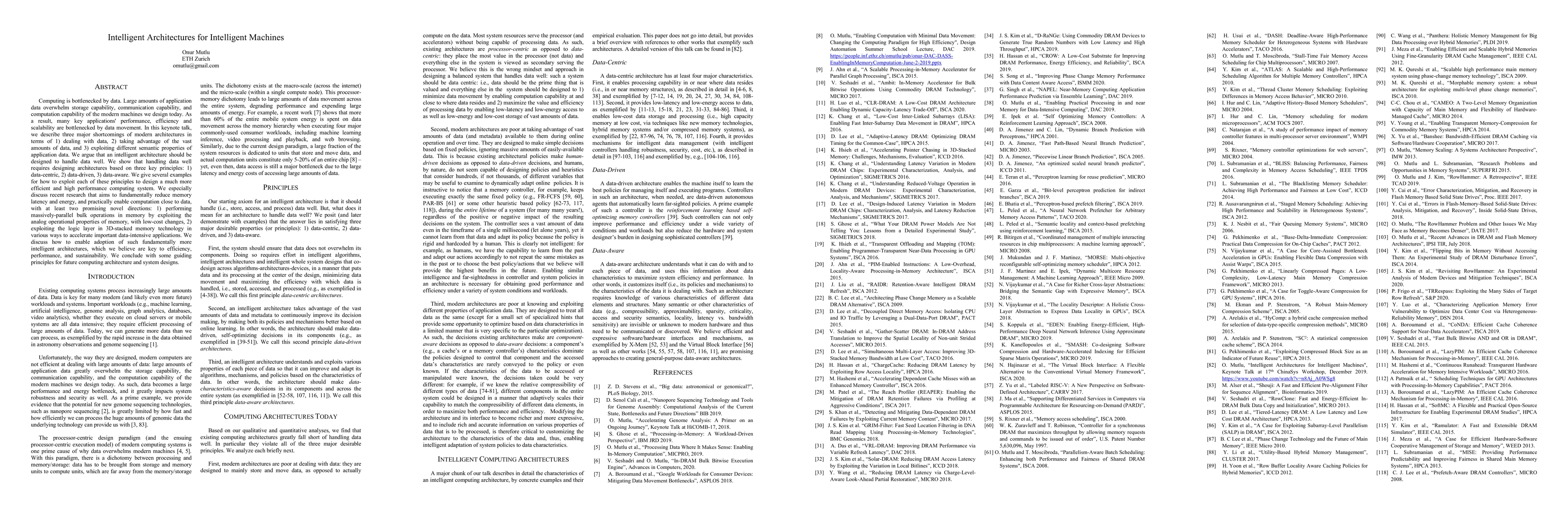 Computing is bottlenecked by data. Large amounts of application data overwhelm storage capability, communication capability, and computation capability of the modern machines we design today. As a result, many key applications' performance, efficiency and scalability are bottlenecked by data movement. In this keynote talk, we describe three major shortcomings of modern architectures in terms of 1) dealing with data, 2) taking advantage of the vast amounts of data, and 3) exploiting different semantic properties of application data. We argue that an intelligent architecture should be designed to handle data well. We show that handling data well requires designing architectures based on three key principles: 1) data-centric, 2) data-driven, 3) data-aware. We give several examples for how to exploit each of these principles to design a much more efficient and high performance computing system. We especially discuss recent research that aims to fundamentally reduce memory latency and energy, and practically enable computation close to data, with at least two promising novel directions: 1) performing massively-parallel bulk operations in memory by exploiting the analog operational properties of memory, with low-cost changes, 2) exploiting the logic layer in 3D-stacked memory technology in various ways to accelerate important data-intensive applications. We discuss how to enable adoption of such fundamentally more intelligent architectures, which we believe are key to efficiency, performance, and sustainability. We conclude with some guiding principles for future computing architecture and system designs.
