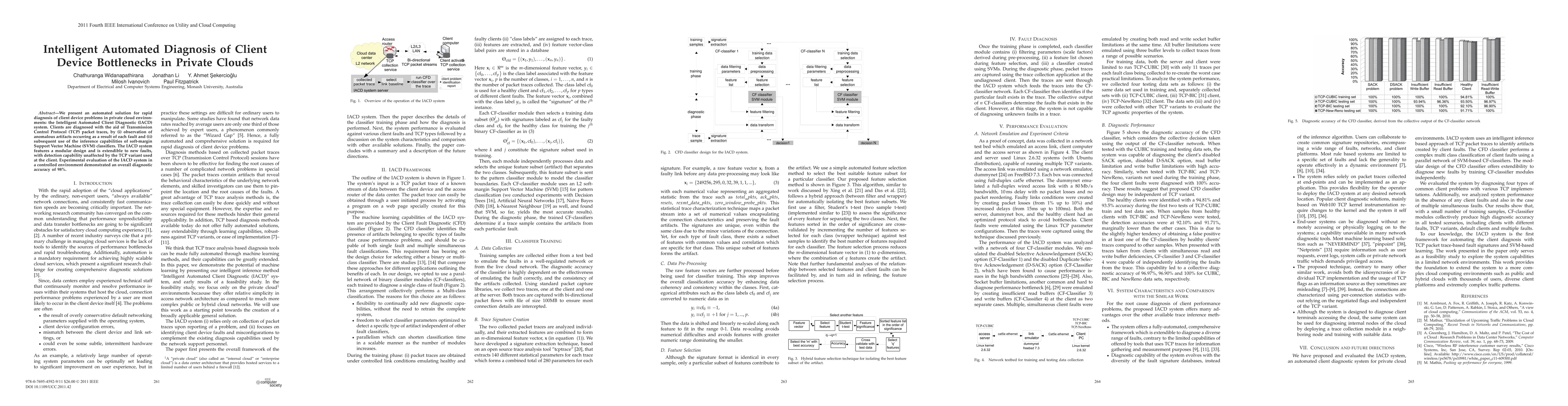 The Intelligent Automated Client Diagnostic (IACD) system uses TCP packet traces and SVM classifiers to rapidly diagnose client device issues in private cloud environments, achieving 98% accuracy in controlled tests. The system's modular design allows for easy extension to new fault types.