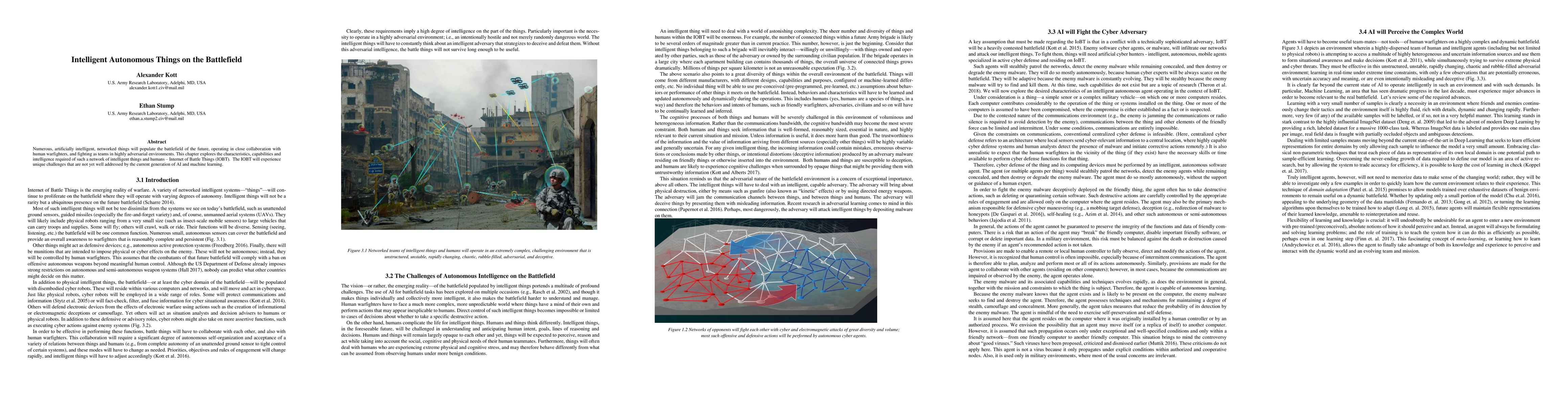 Numerous, artificially intelligent, networked things will populate the battlefield of the future, operating in close collaboration with human warfighters, and fighting as teams in highly adversarial environments. This chapter explores the characteristics, capabilities and intelli-gence required of such a network of intelligent things and humans - Internet of Battle Things (IOBT). The IOBT will experience unique challenges that are not yet well addressed by the current generation of AI and machine learning.