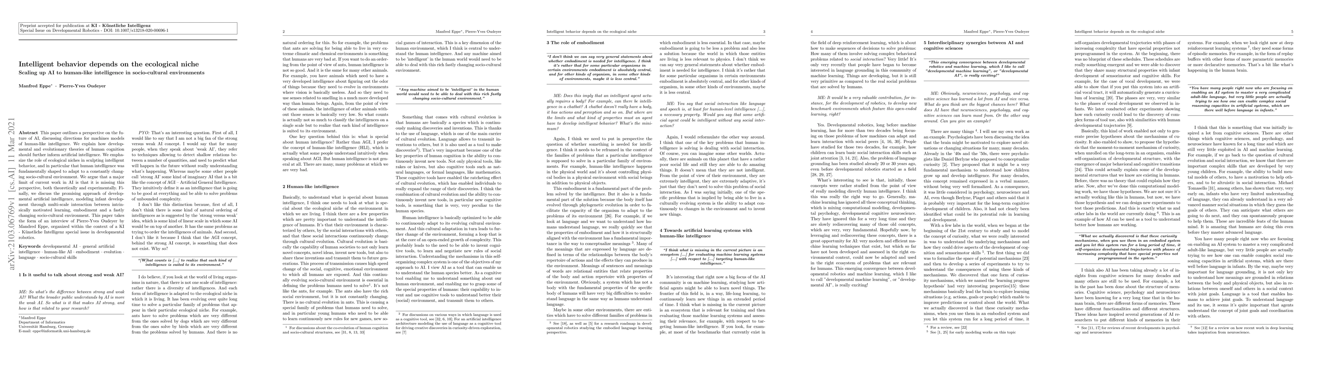 This paper outlines a perspective on the future of AI, discussing directions for machines models of human-like intelligence. We explain how developmental and evolutionary theories of human cognition should further inform artificial intelligence. We emphasize the role of ecological niches in sculpting intelligent behavior, and in particular that human intelligence was fundamentally shaped to adapt to a constantly changing socio-cultural environment. We argue that a major limit of current work in AI is that it is missing this perspective, both theoretically and experimentally. Finally, we discuss the promising approach of developmental artificial intelligence, modeling infant development through multi-scale interaction between intrinsically motivated learning, embodiment and a fastly changing socio-cultural environment. This paper takes the form of an interview of Pierre-Yves Oudeyer by Mandred Eppe, organized within the context of a KI - K{\"{u}}nstliche Intelligenz special issue in developmental robotics.