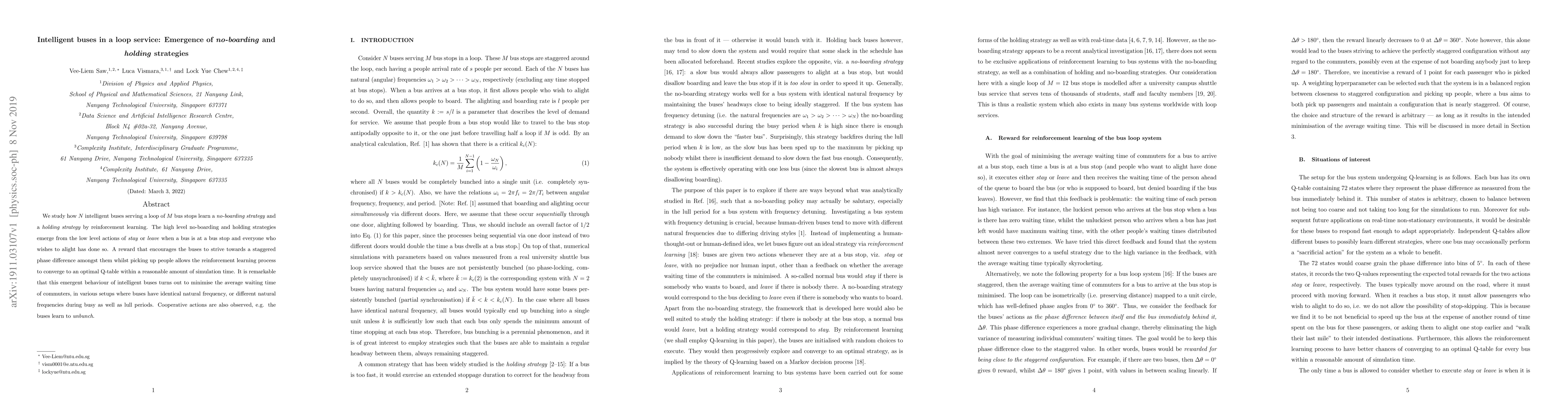 We study how $N$ intelligent buses serving a loop of $M$ bus stops learn a \emph{no-boarding strategy} and a \emph{holding strategy} by reinforcement learning. The high level no-boarding and holding strategies emerge from the low level actions of \emph{stay} or \emph{leave} when a bus is at a bus stop and everyone who wishes to alight has done so. A reward that encourages the buses to strive towards a staggered phase difference amongst them whilst picking up people allows the reinforcement learning process to converge to an optimal Q-table within a reasonable amount of simulation time. It is remarkable that this emergent behaviour of intelligent buses turns out to minimise the average waiting time of commuters, in various setups where buses have identical natural frequency, or different natural frequencies during busy as well as lull periods. Cooperative actions are also observed, e.g. the buses learn to \emph{unbunch}.