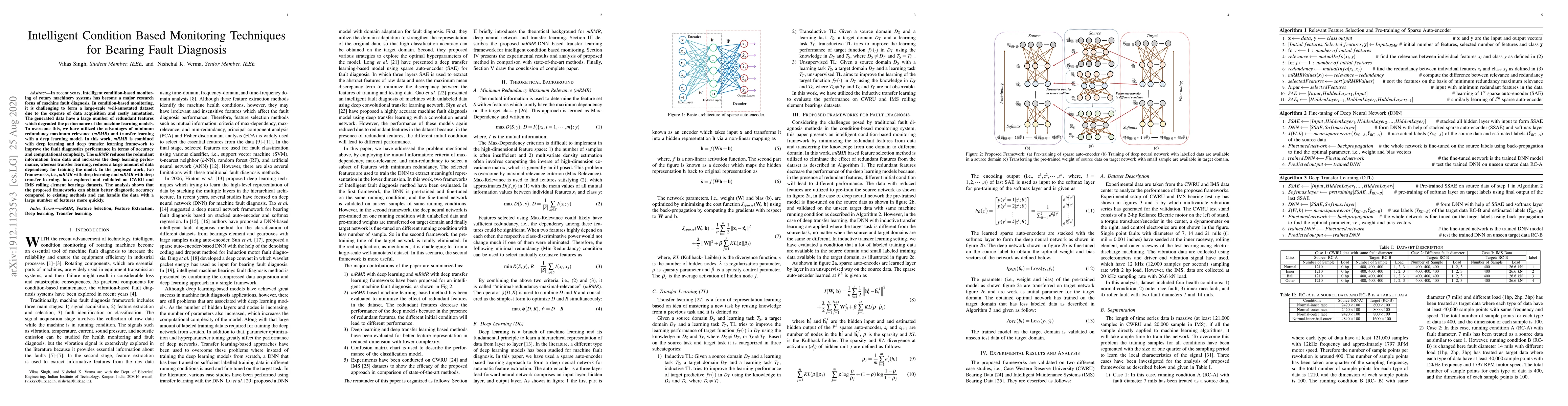 In recent years, intelligent condition-based monitor-ing of rotary machinery systems has become a major researchfocus of machine fault diagnosis. In condition-based monitoring,it is challenging to form a large-scale well-annotated datasetdue to the expense of data acquisition and costly annotation.The generated data have a large number of redundant featureswhich degraded the performance of the machine learning models.To overcome this, we have utilized the advantages of minimumredundancy maximum relevance (mRMR) and transfer learningwith a deep learning model. In this work,mRMRis combinedwith deep learning and deep transfer learning framework toimprove the fault diagnostics performance in terms of accuracyand computational complexity. ThemRMRreduces the redundantinformation from data and increases the deep learning perfor-mance, whereas transfer learning, reduces a large amount of datadependency for training the model. In the proposed work, twoframeworks, i.e.,mRMRwith deep learning andmRMRwith deeptransfer learning, have explored and validated on CWRU andIMS rolling element bearings datasets. The analysis shows thatthe proposed frameworks can obtain better diagnostic accuracycompared to existing methods and can handle the data with alarge number of features more quickly.